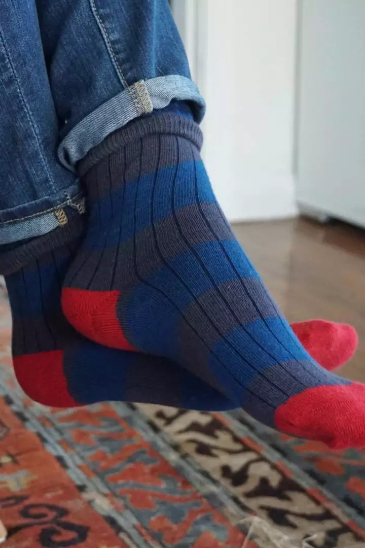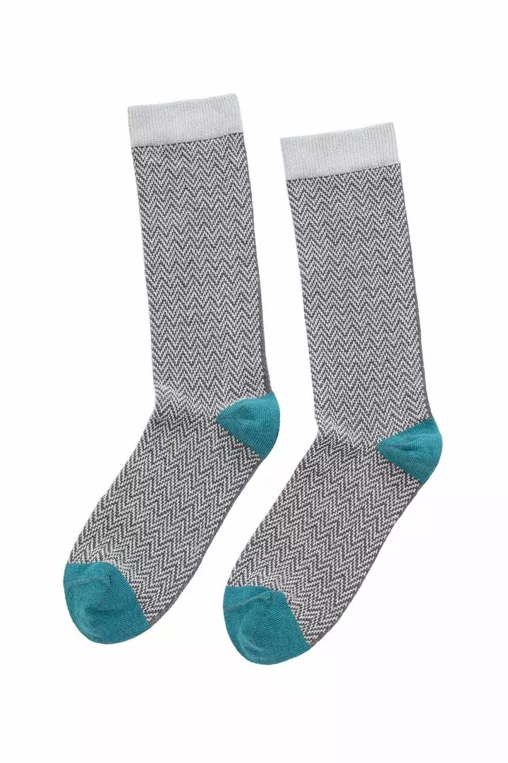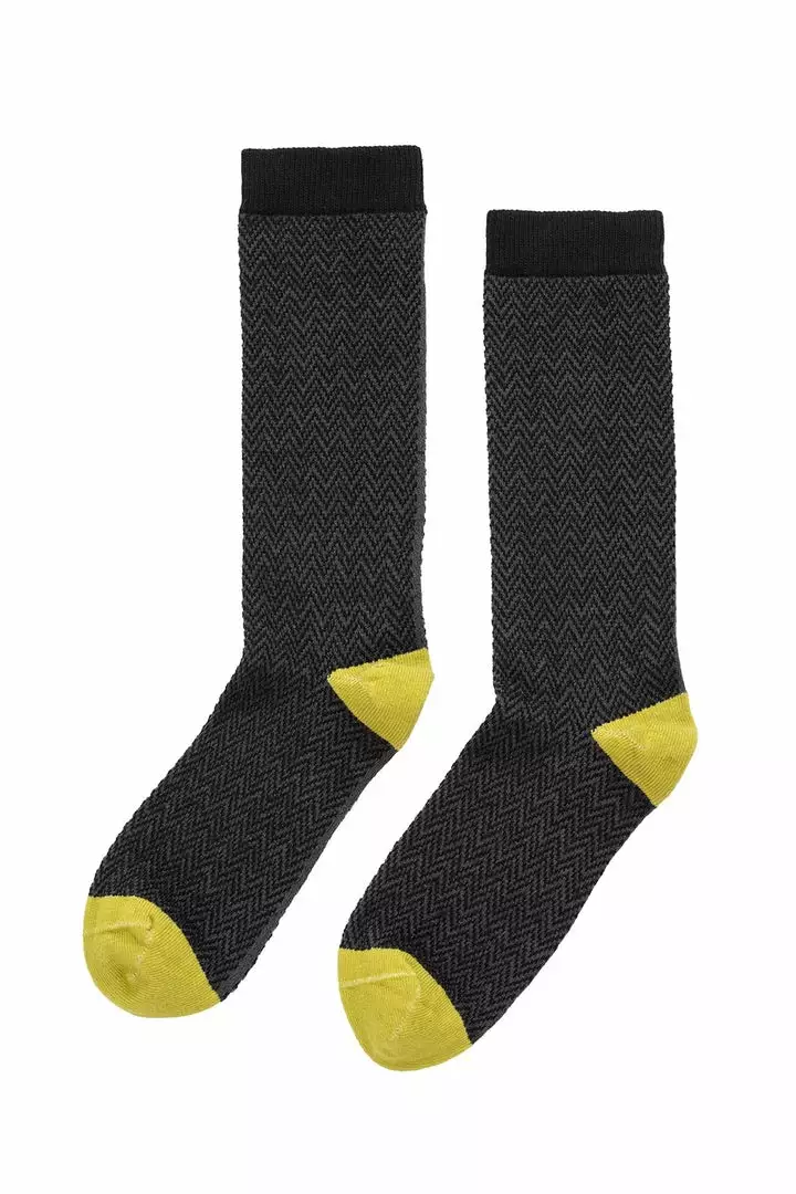 ziggity zag. we love a herringbone and these socks get a pop of whimsy with their contrast toe and heel cap. crafted from an organic cotton knit, that has the perfect amount of stretch, these will retain their shape and elasticity for years, as well as segue seamlessly from work to weekend.