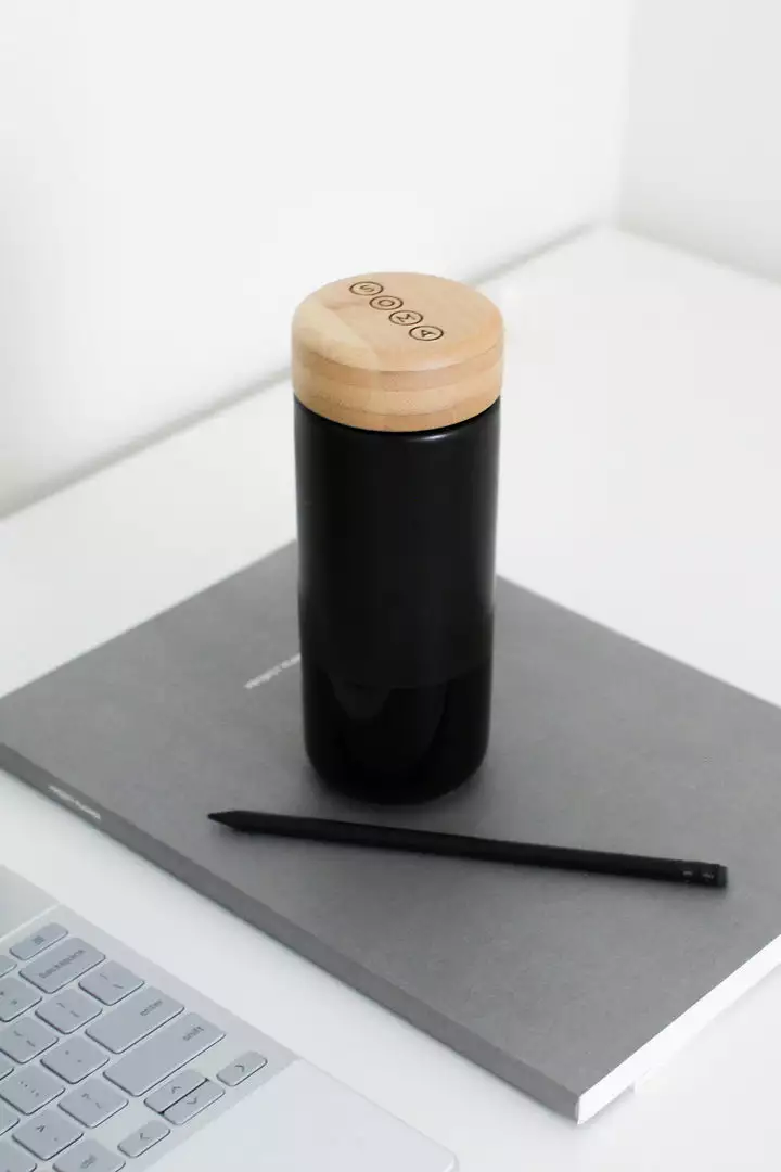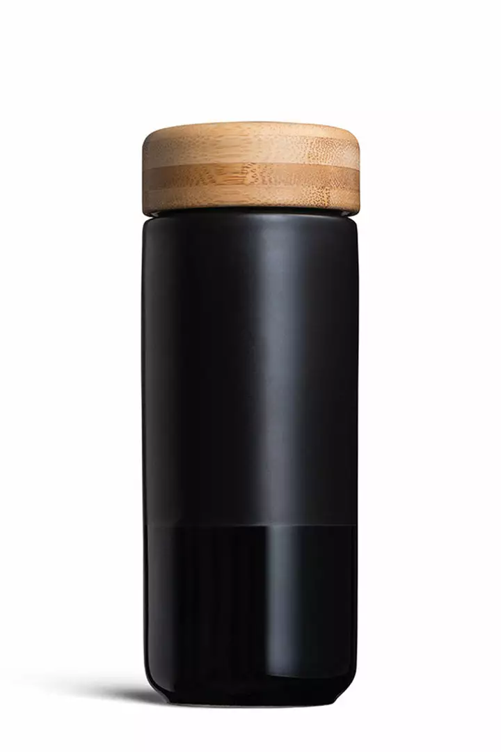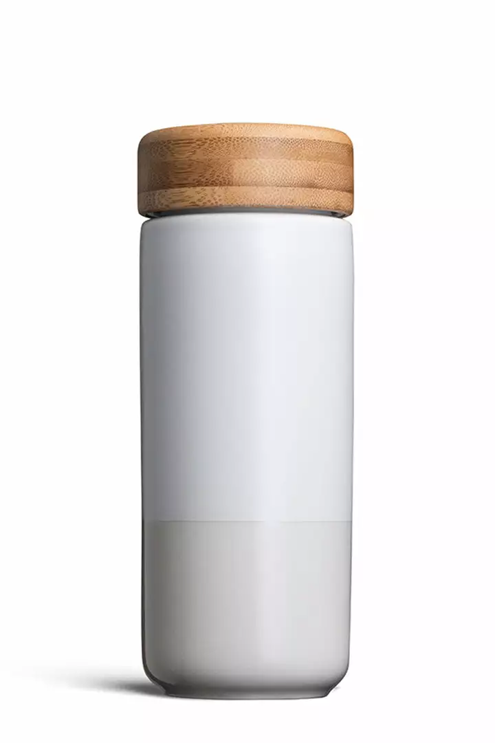 Not only does the double-walled ceramic base hold your fave hot (or cold) beverage, but it also doesn’t alter the taste like a metal version. A leak-proof bamboo lid tops it off.