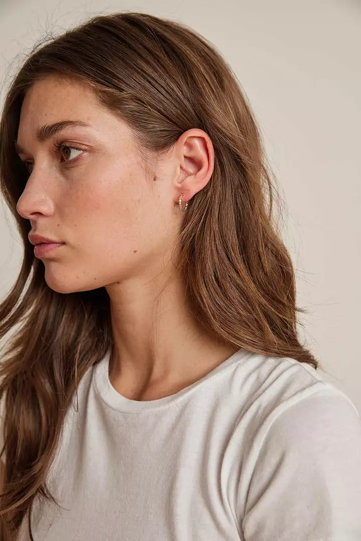 Hoop dreams. Handcrafted from a 14K gold fill, these petite hoops look like tiny beads hammered together to form a chic loop. These beauties give that perfect hint of everyday sparkle and are great solo or layered if you have multiple ear piercings.