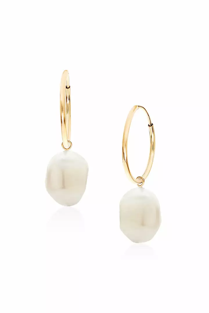 The big drop. Handcrafted in the big apple these feminine hoops feature a gold-fill loop with a freshwater pearl dangler that can easily be slipped off for a simpler look. Either way, it’s a versatile beauty.