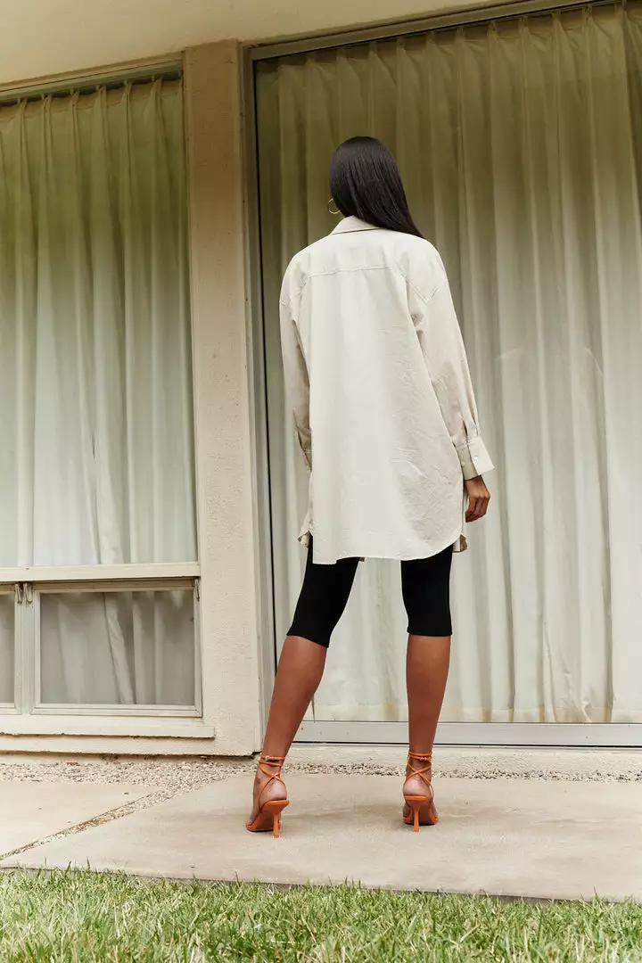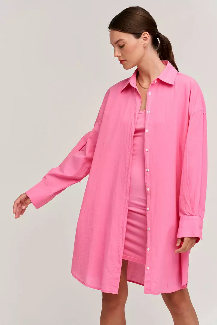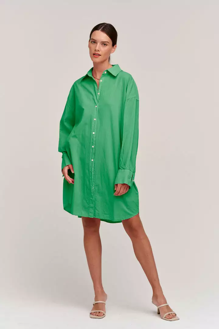 We took the classic button up and super-sized it. Crafted from a softly-structured cotton poplin, this shirt is long enough to be a shirt dress or left open as a cool layering piece. Work, weekend or vacation.