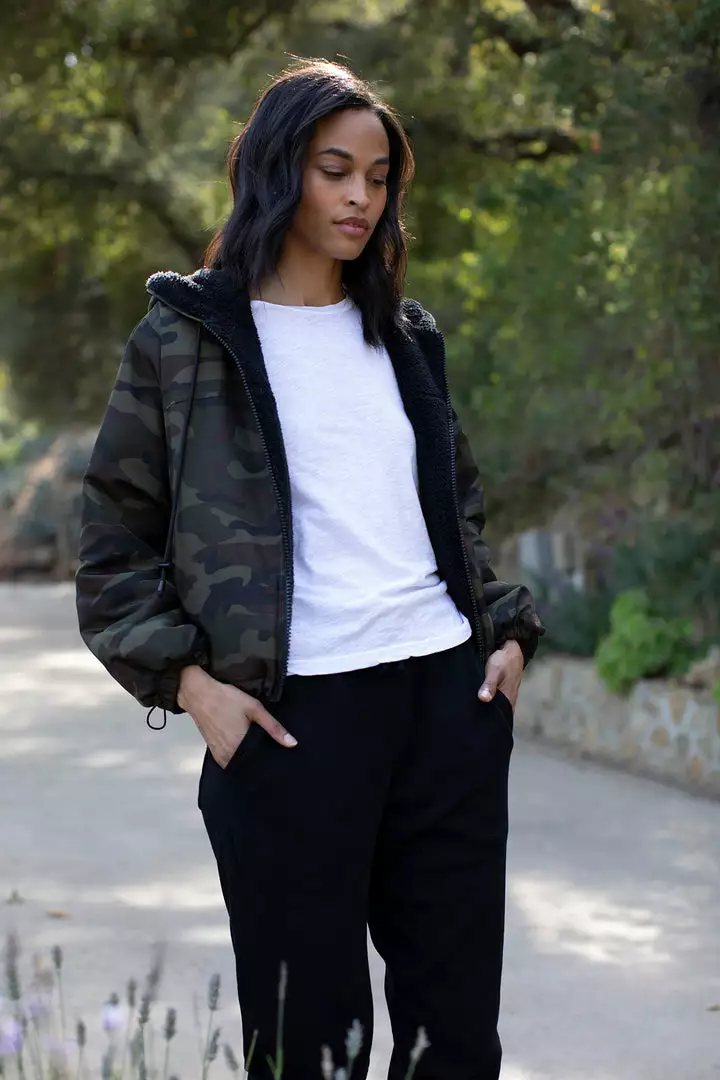 One side is an urban-camouflage nylon while the flipside in a cozy, faux sherpa. Utilitarian details pair with considered design tweaks, like the puffed sleeve and shorter waist. Cool and versatile.
