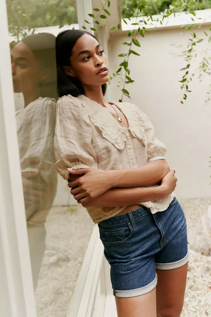 How sweet it is. Crafted from a medium-weight linen and with seasonal-statement pilgrim collar. A perfectly puffed sleeve that hits at the elbow adds an additional (and chic) spring style note.