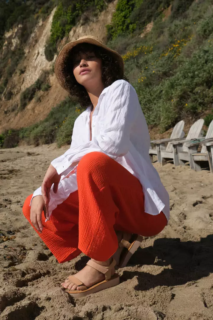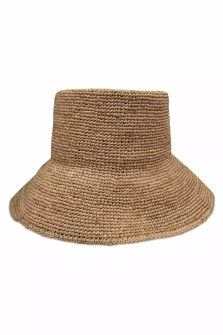 Here’s a cool update on a classic bucket hat with its slightly deeper crown and crafted from the natural raffia crochet. Perfect for keeping the sun out of your face during the warmer seasons.