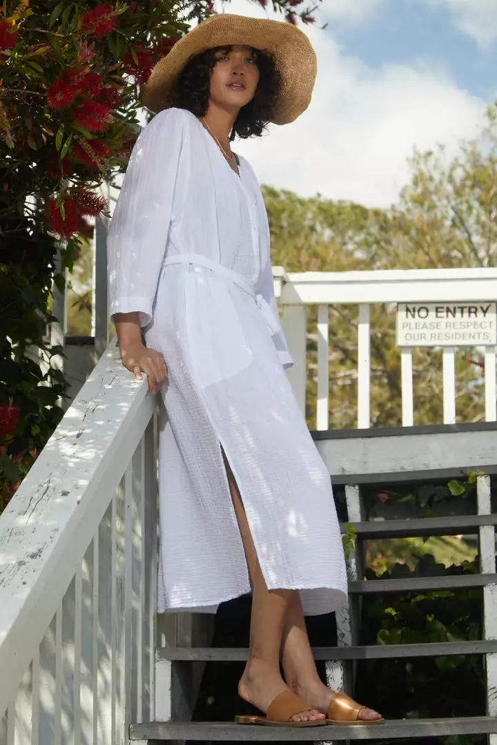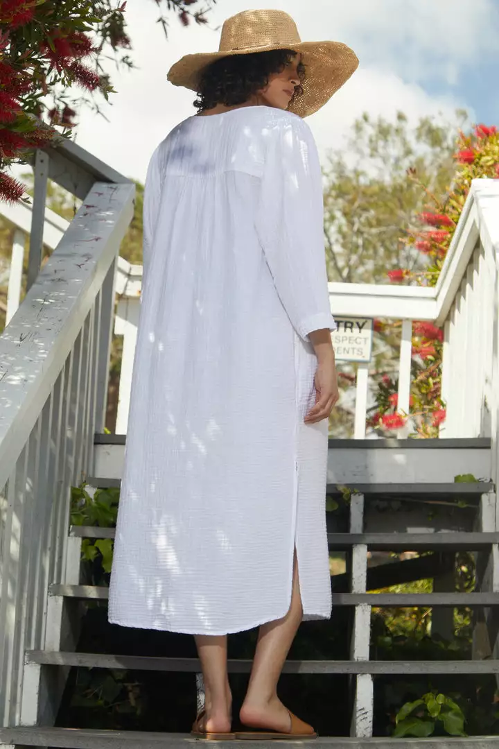 An echo of a classic kaftan this cotton gauze midi dress has all the relaxed details of a summer classic with a half button placket and a 3/4 sleeve.