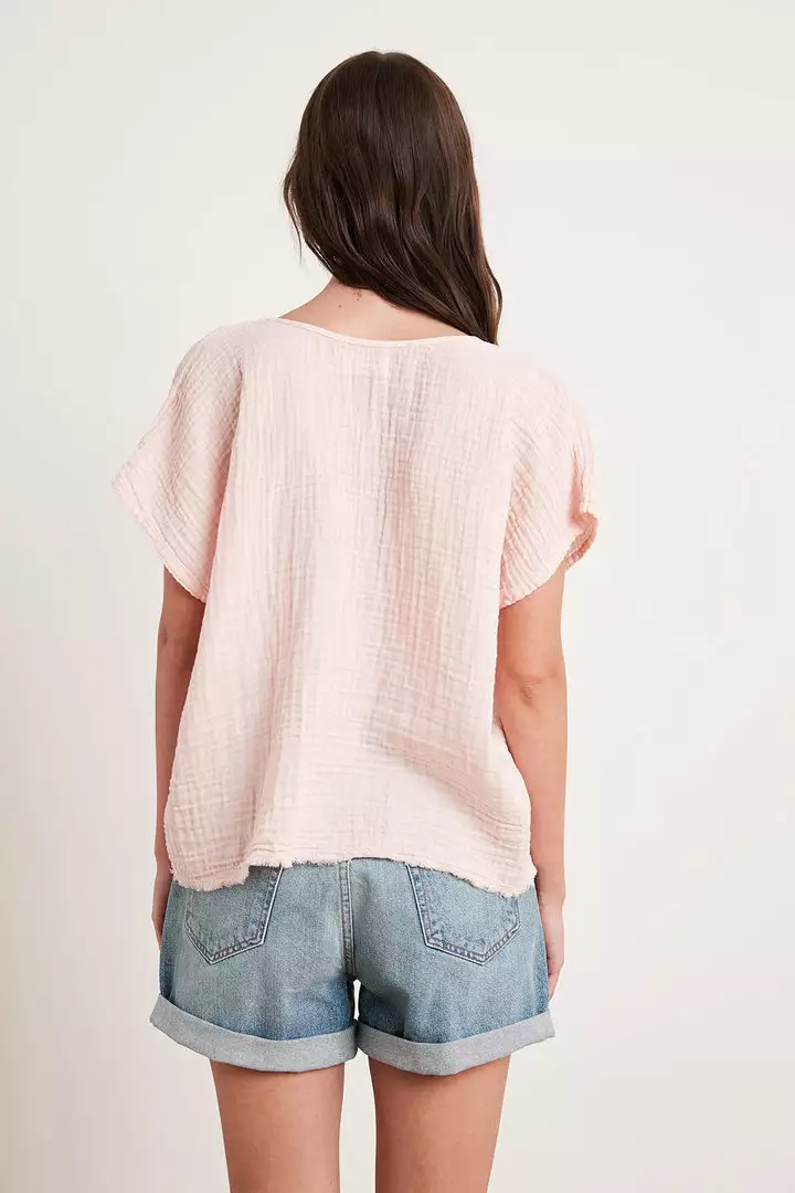 For those days when you want a tee but a little dressier. This cotton gauze top features a gorgeous natural texture and raw hem detail. Relaxed, breezy and effortless.
