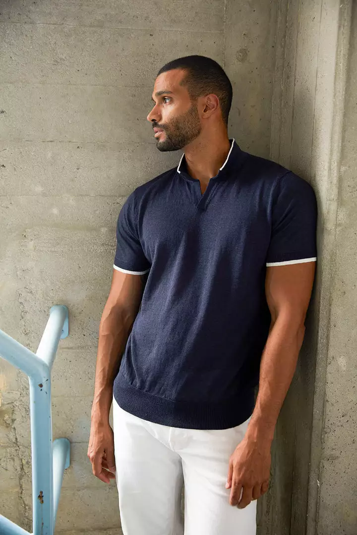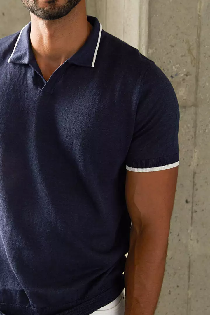 We took a retro-tipped polo and elevated it by sourcing a linen knit with just enough stretch to give a tailored fit. In a classic navy with the traditional ribbed neck and sleeves, as well as white trim.