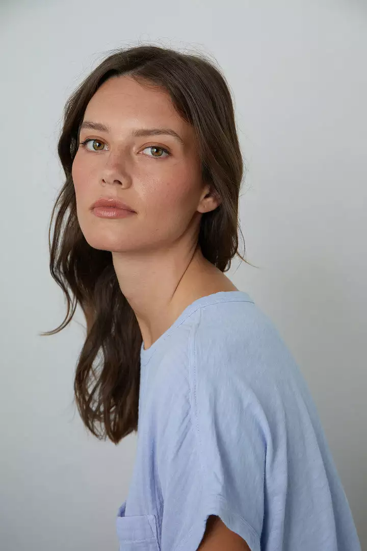 The timeless allure of a cocoon silhouette with its subtle tapering towards the hemline is undeniable. This dress is also a study in subtle contrasts—cotton gauze front with a cotton slub back.
