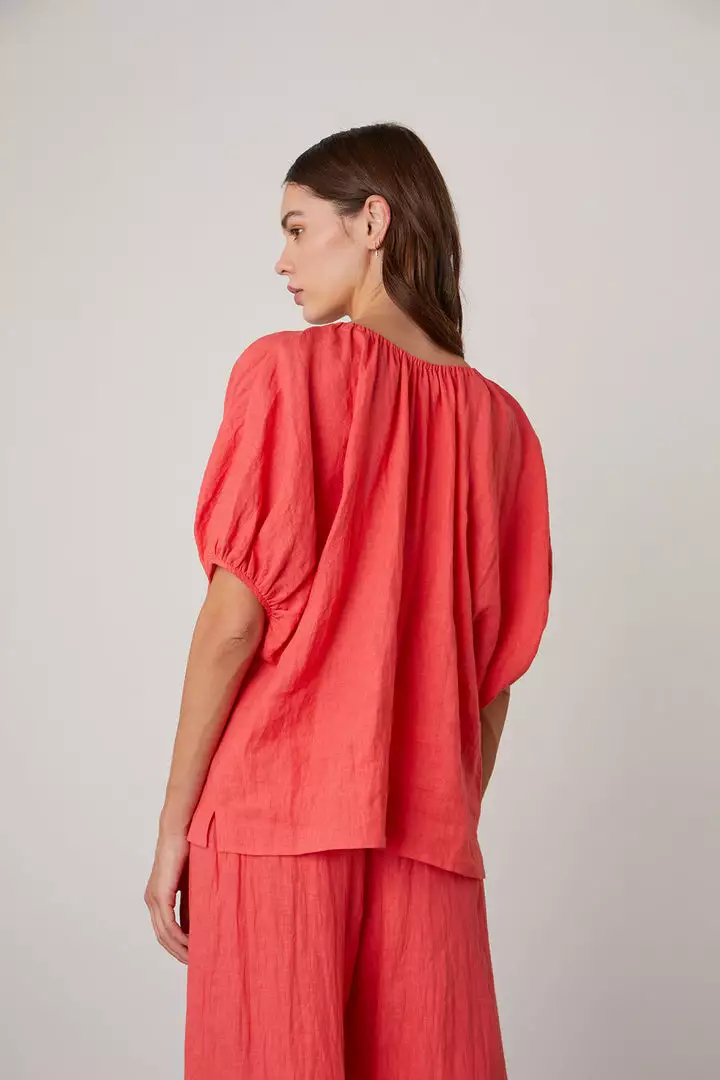 This blouse has a beautiful cocoon silhouette with its cinched sleeve and neckline. The breezy linen keeps it effortless while the day-to-night styling options feel endless with this beauty.