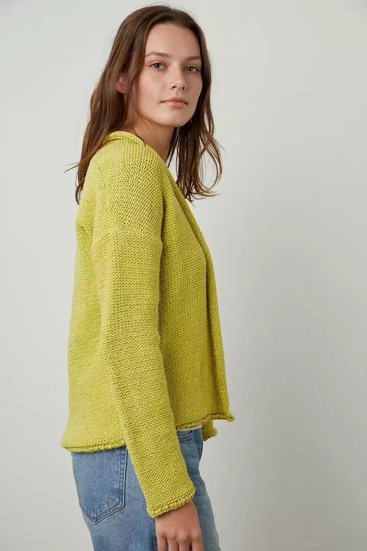 Simple statements. Crafted from our loose-knit textured yarn, this easy cardigan is simplicity personified. Featuring an open front with a slight roll to the collar and a drop shoulder seam; this is all you need for a summer dose of nonchalant cool.