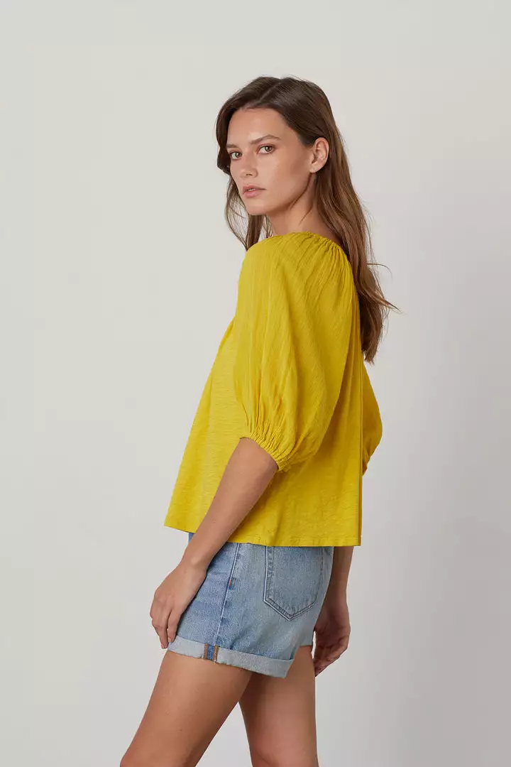 A modern take on a classic peasant blouse arrives with it’s easy mix of signature cotton fabric in the body and the textured cotton gauze on the sleeves. On or off the shoulder gives tons of styling options.