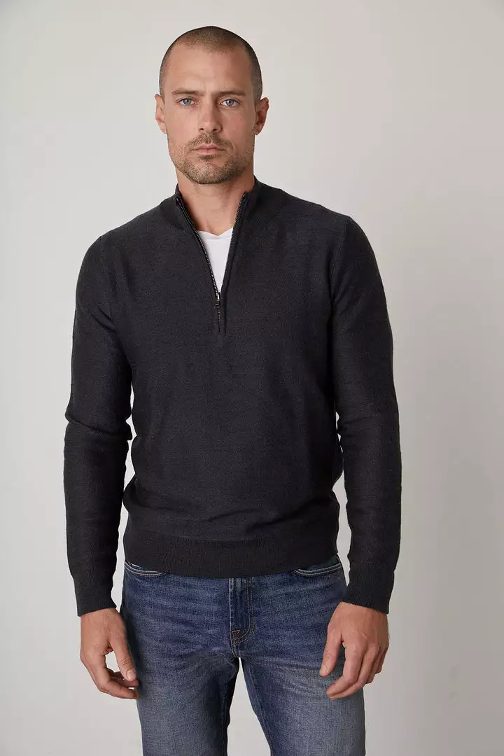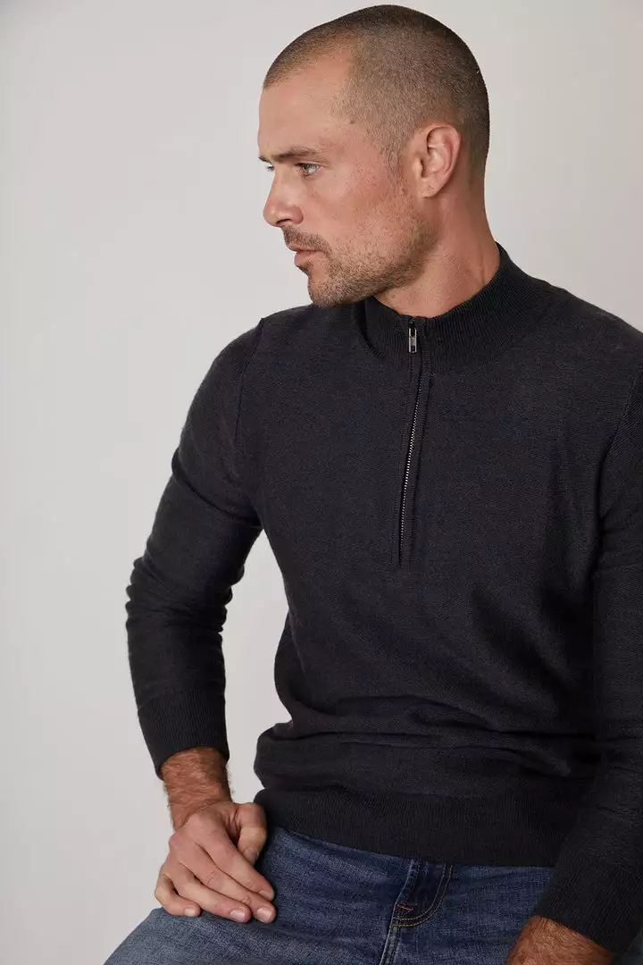 A wool-blend sweater that can easily be dressed up or down. A classic vintage-inspired silhouette, featuring a mock neck and ½ zip on the front. Work to weekend.