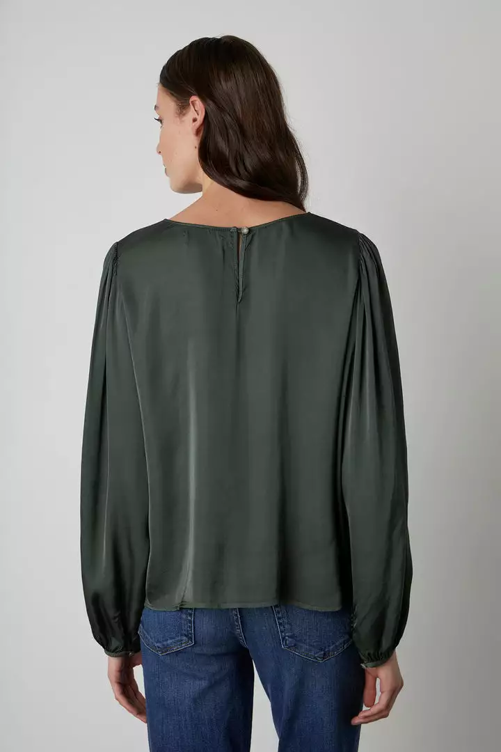A thoughtfully considered design that lets the sheen of the satin woven speak for itself. Highlighting the natural drape, there’s a shirred seam at the shoulder that creates a delicate volume in the sleeves.