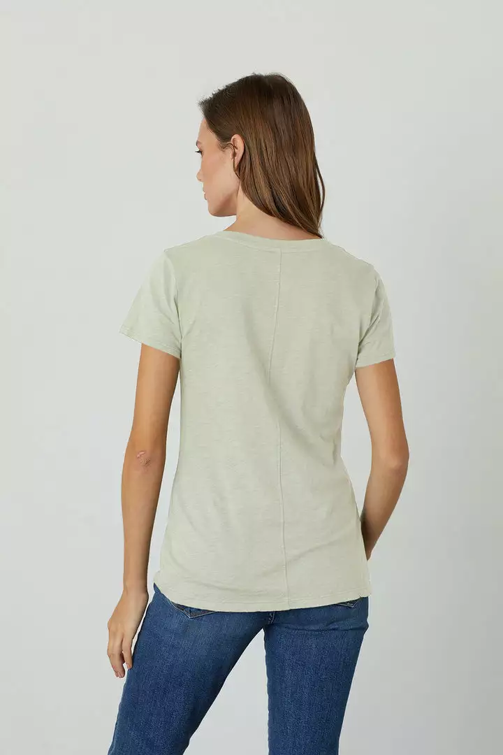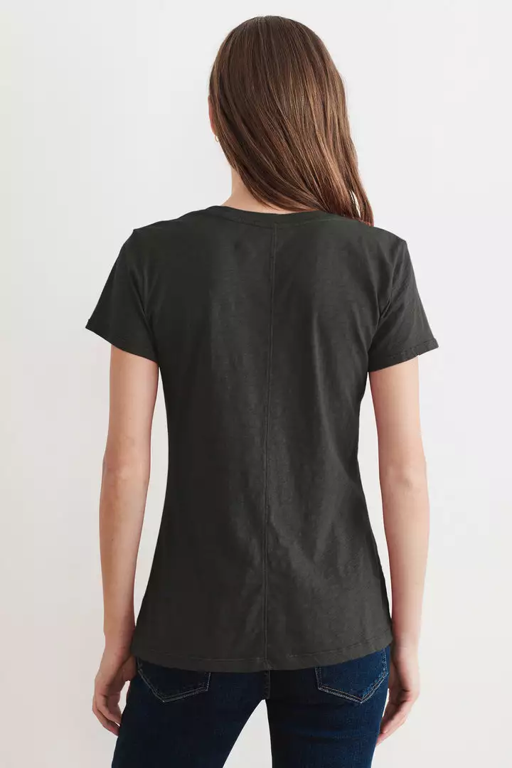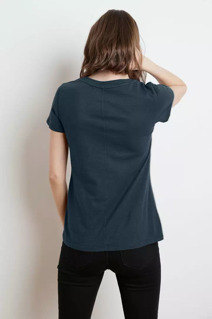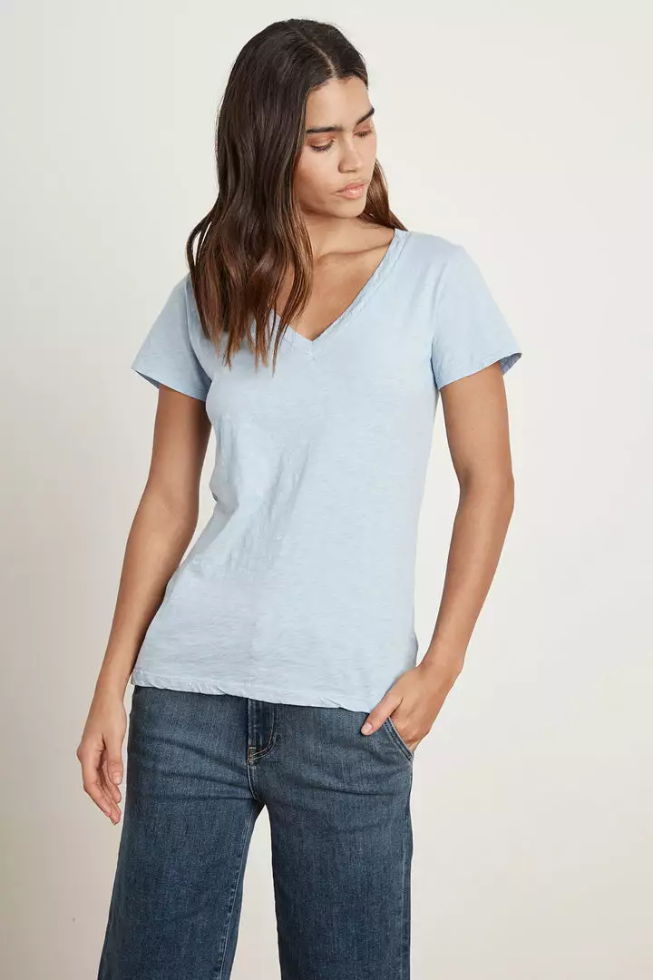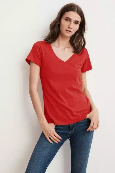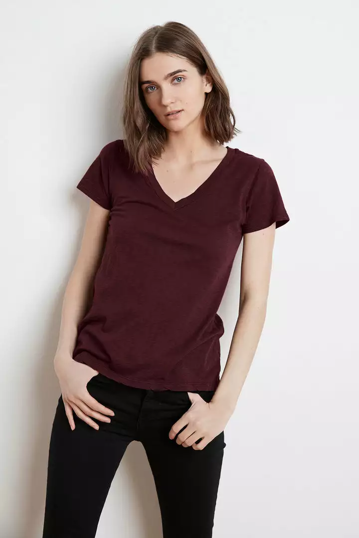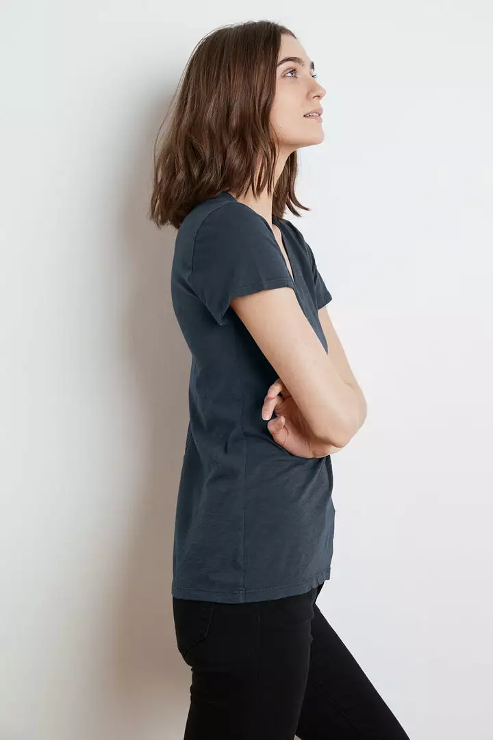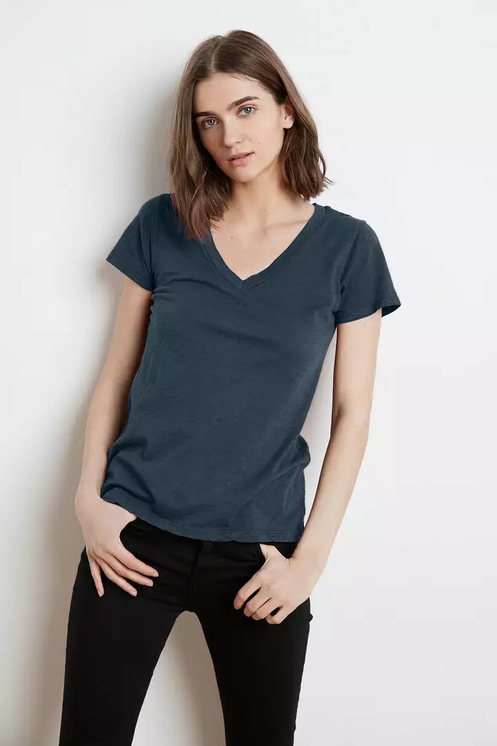 this is a great v-neck tee. a little bit preppy with a pinch of tomboy style, it’s the perfect basic. cut from our luxe cotton slub, it’s super soft, washes beautifully and hugs your body in all the right spots.