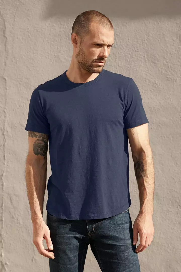 A medium-weight slub knit with a soft heathered texture lends a casual, yet cool vibe. Subtle details like the curved hemline give a polished look even when untucked, and the self-binding crew neck give this classic an easy-to-dress-up appeal. Great under a tailored jacket.