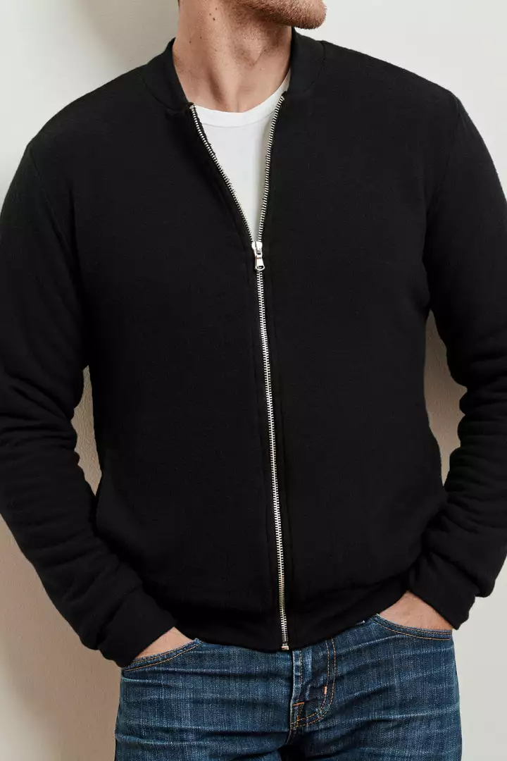 just zip it. crafted from our signature cozy jersey, this bomber style is the perfect lightweight, transitional piece. with a soft faux sherpa lining and all the traditional trims like ribbed bands at the neckline, cuffs and hem, as well slash pockets and a zipper front. think of this as a cool hybrid between a cardigan and a casual jacket.