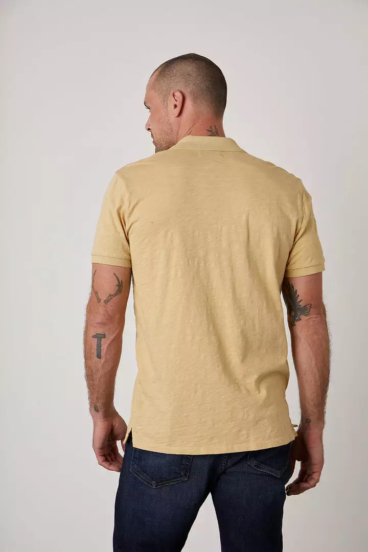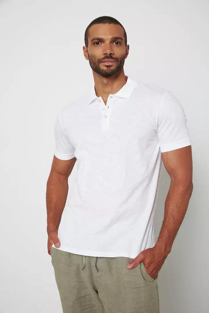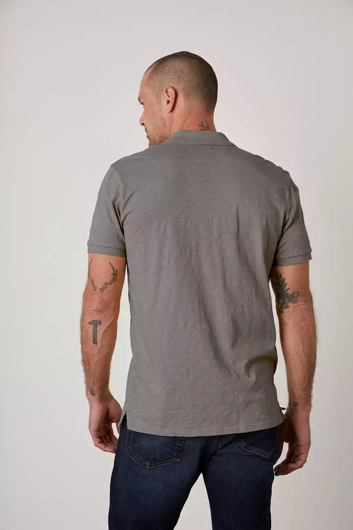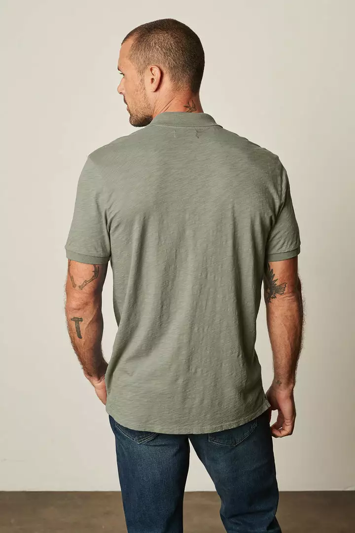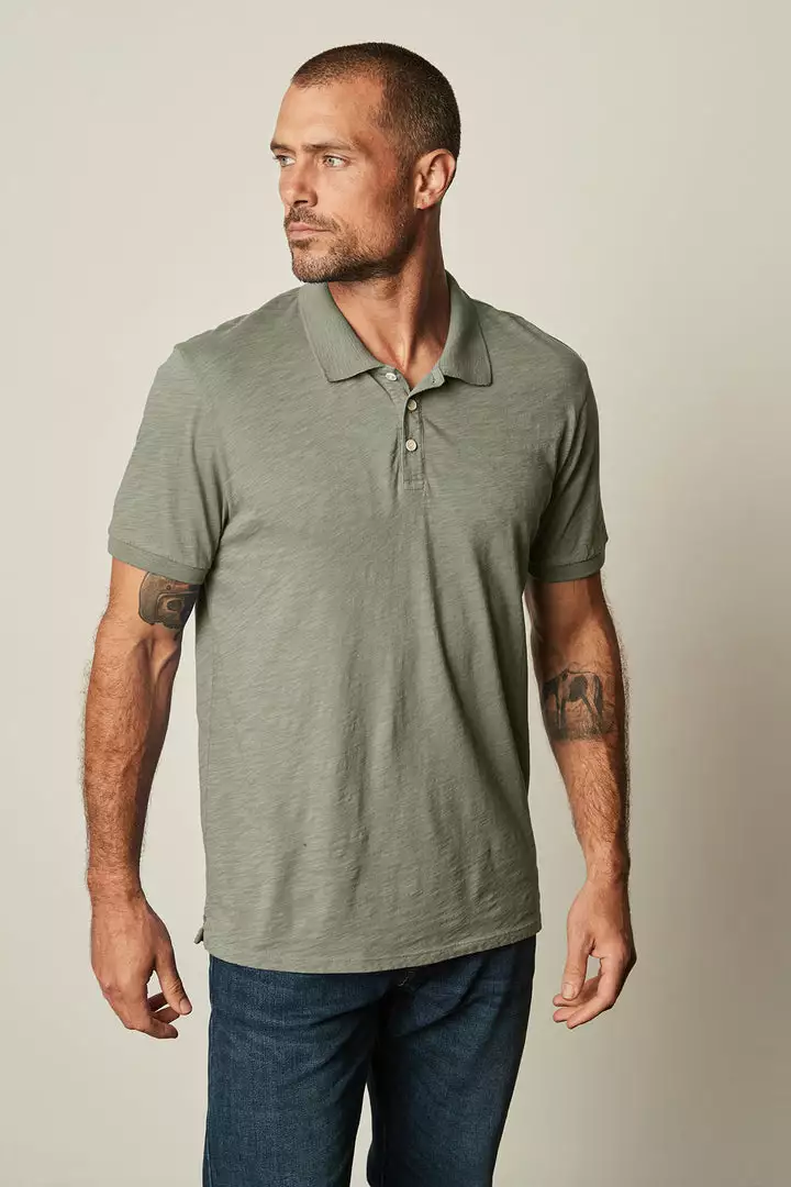 Our celebrated cotton slub in a classic polo-shirt silhouette with 3-button neckline, ribbed collar, and ribbed trim on the sleeves. The heathered texture of this knit gives it soft, vintage-feel hand.