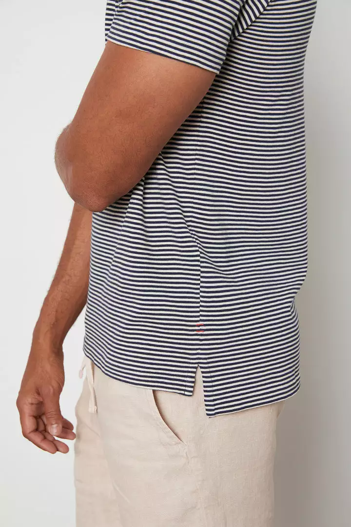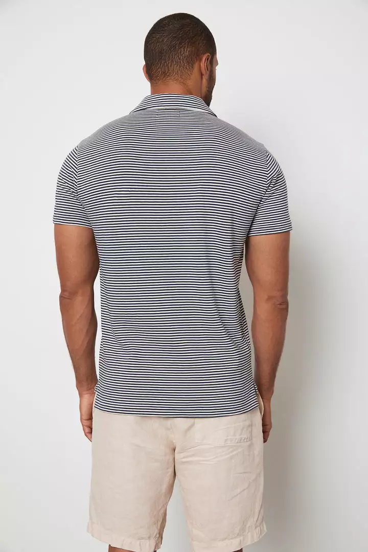 A crisp navy and white stripe signals the warm weather is here. Crafted from a soft jersey knit and with a buttonless placket give this polo a sleek, modern vibe along with the smaller-sized collar.