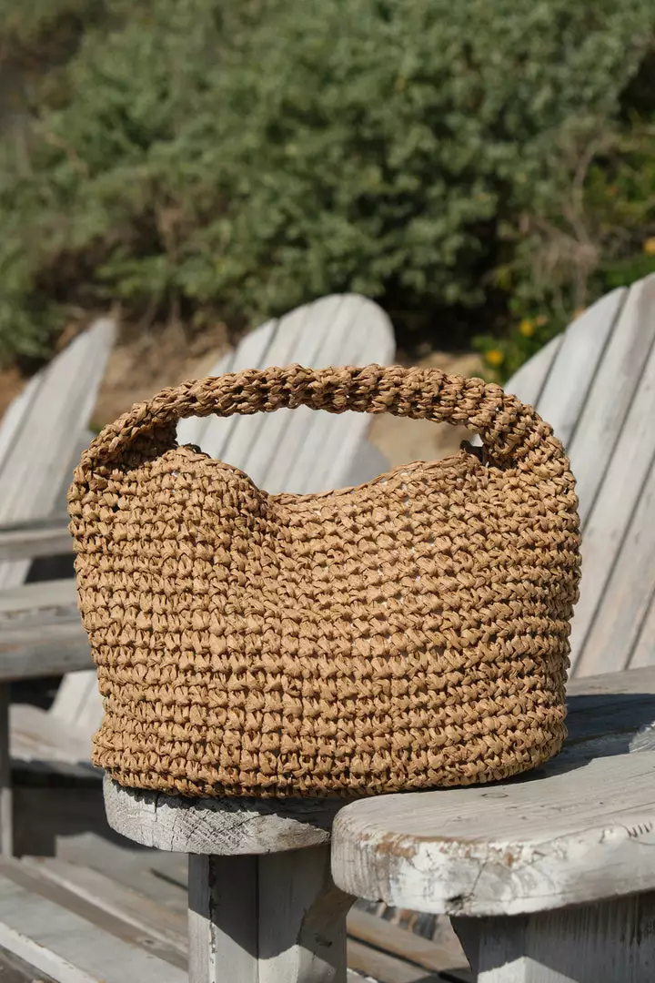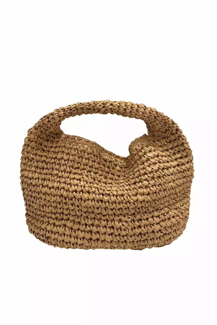 Perfect for a day or night out. This diminutive tote is crafted from a flexible paper straw that has just enough structure to keep all your incidentals secure. Loop it over your wrist and go.