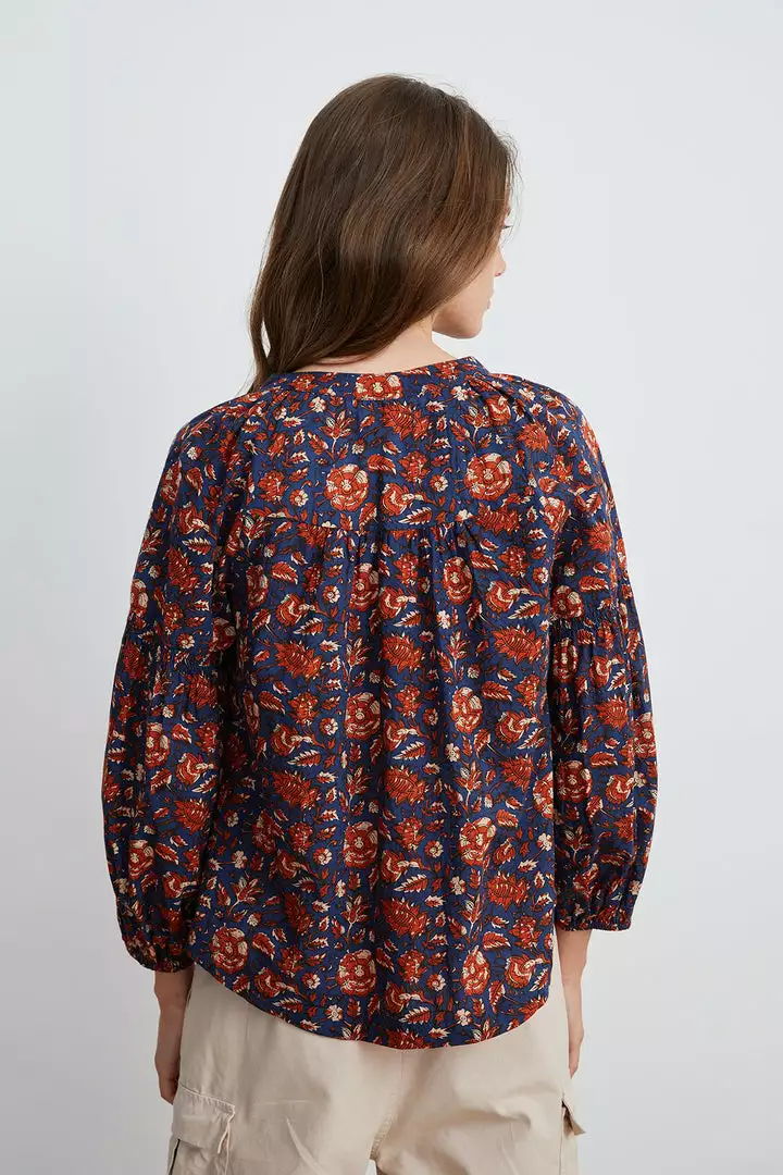 Featuring a bohemian block print and a relaxed fit, this pop-on blouse is the epitome of casually charming. An elastic cuff and drop-shoulder, shirred seam make a beautiful sleeve statement.