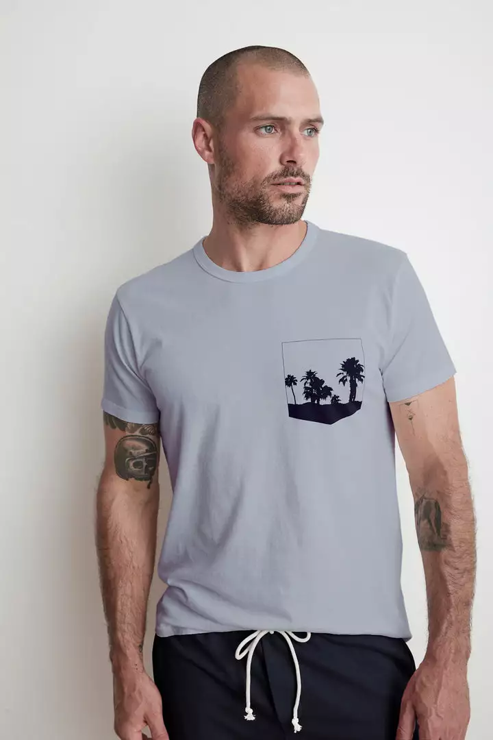 A simply great cotton tee with a faux pocket graphic on the front with some California palm trees.