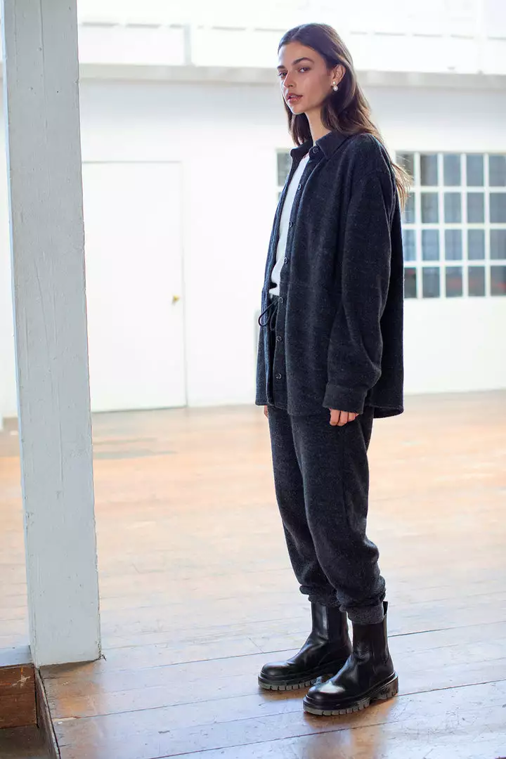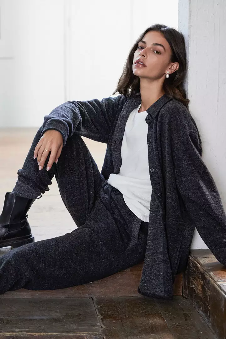 The newest category of weekend coverups is the shacket. We crafted our version from an extra soft fleece with a button-up front and traditional collar with an oversized styling. A Sunday essential.