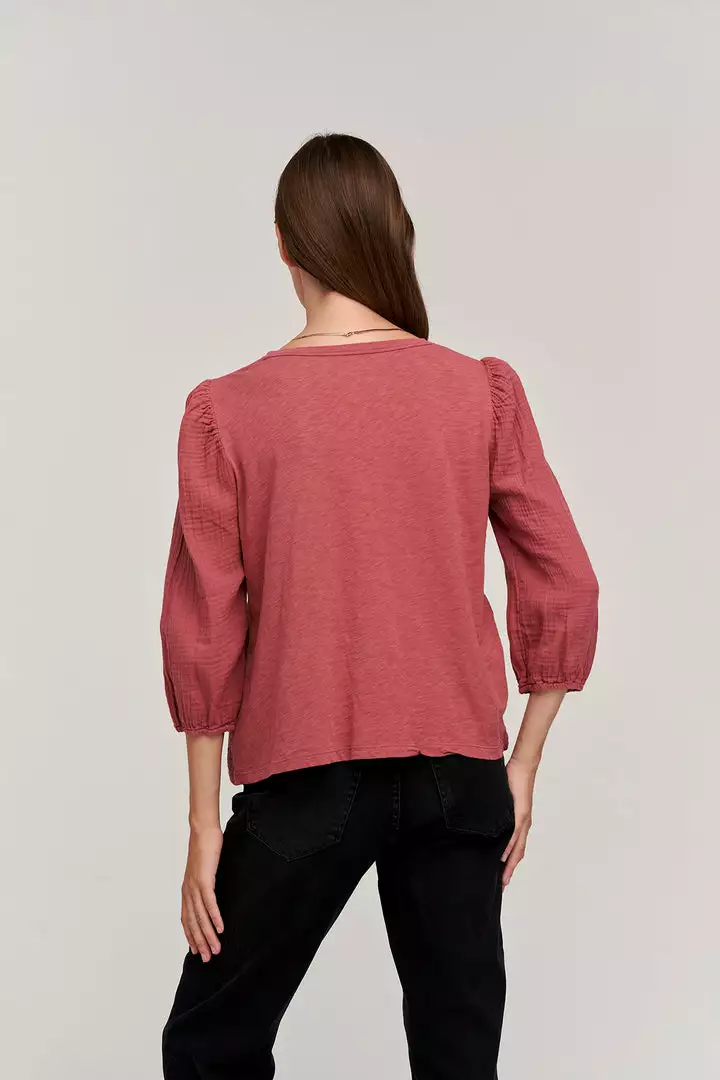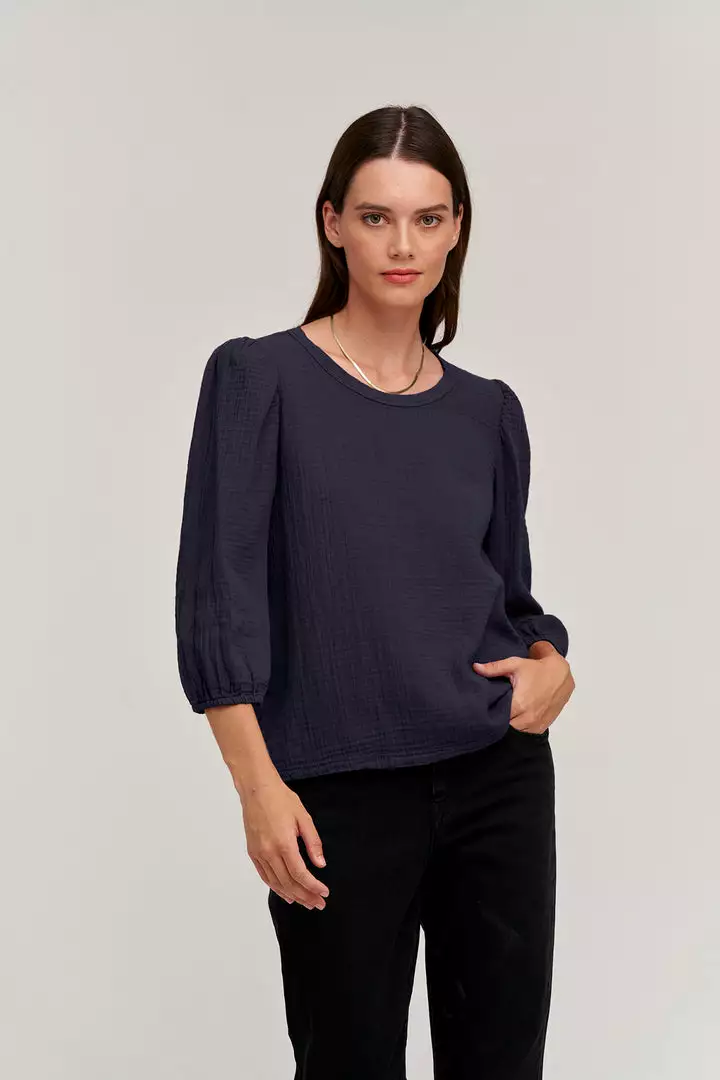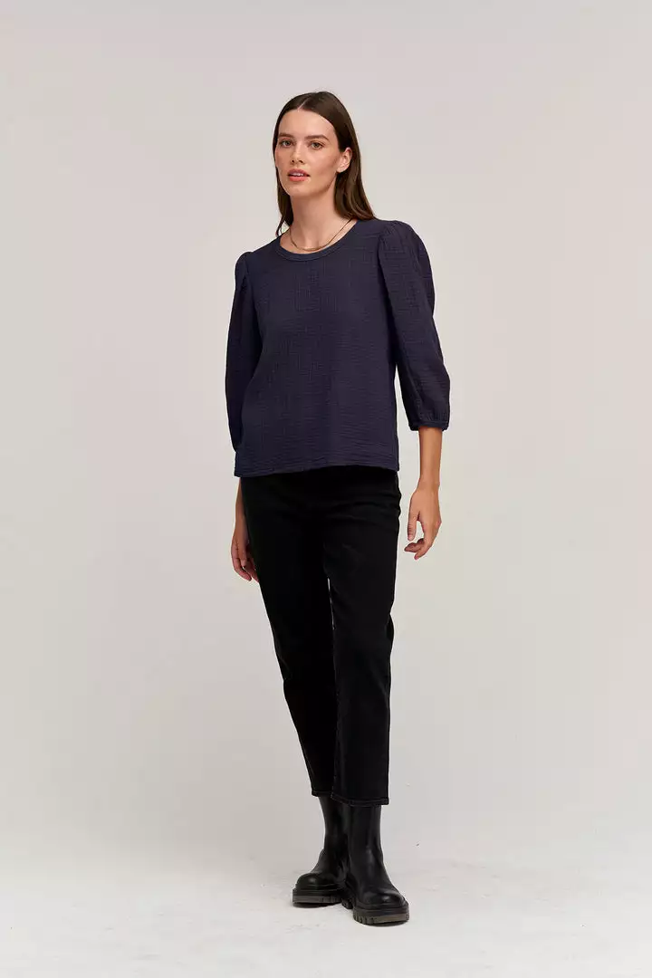 The juxtaposition of a cotton gauze front and sleeves with the cotton slub back gives this top an unexpected twist. A puffed sleeve with a slight crop makes this an anytime essential.