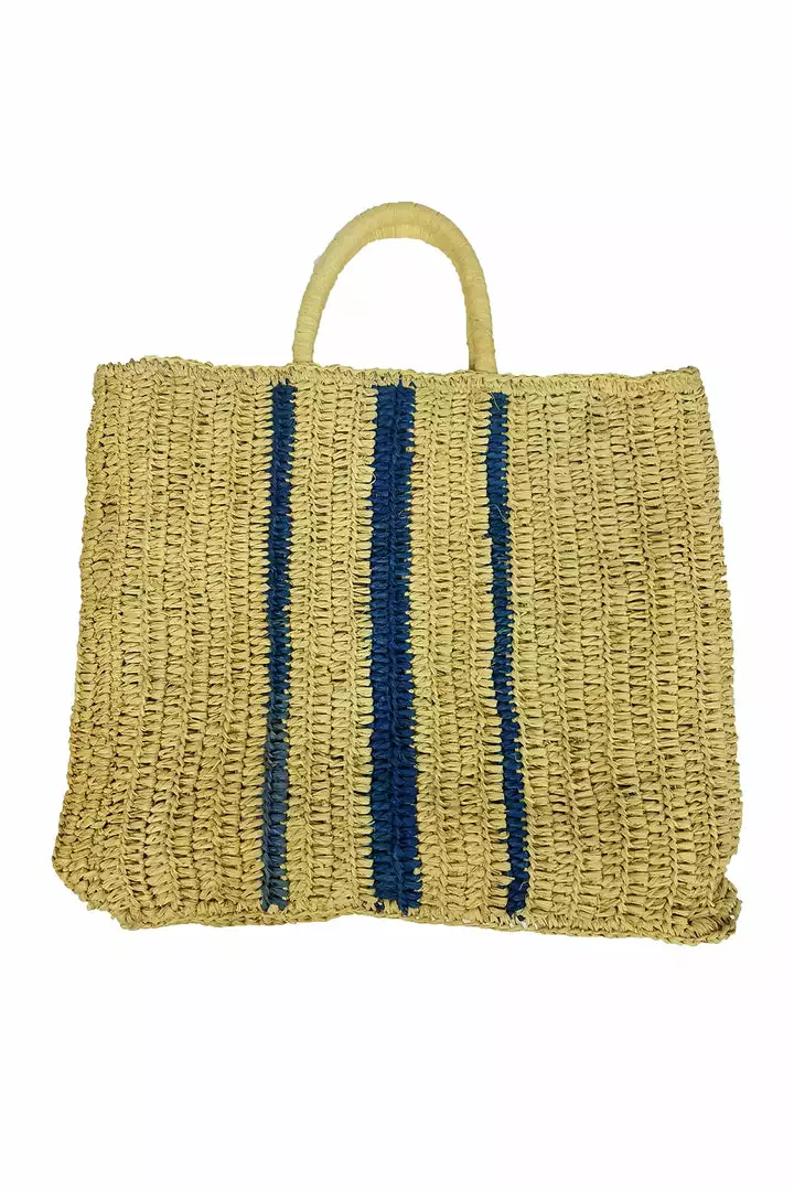Relaxed charms. Crafted from a woven raffia, this easy tote is sturdy but still laid back. Featuring two handles and a chic selection of blue stripes. Unstructured in style and made for every weekend from now until summer.