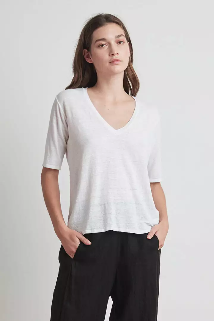 Fresh linen. Crafted from our signature linen knit that has a great heathered texture. This tee has been given a summer update with a v-neckline, half sleeves, and a relaxed silhouette.