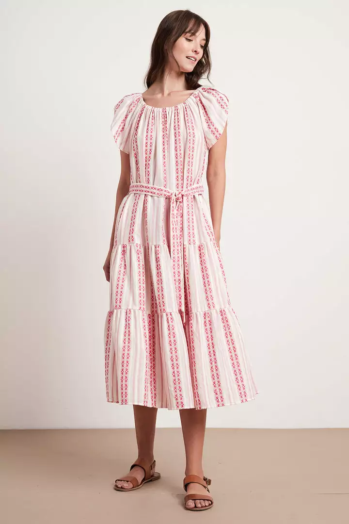 Inspired by our favorite vacation spot in Greece, this pop-on frock is crafted from a classic jacquard with a tiered skirt and split tulip sleeves. See you by the sea.