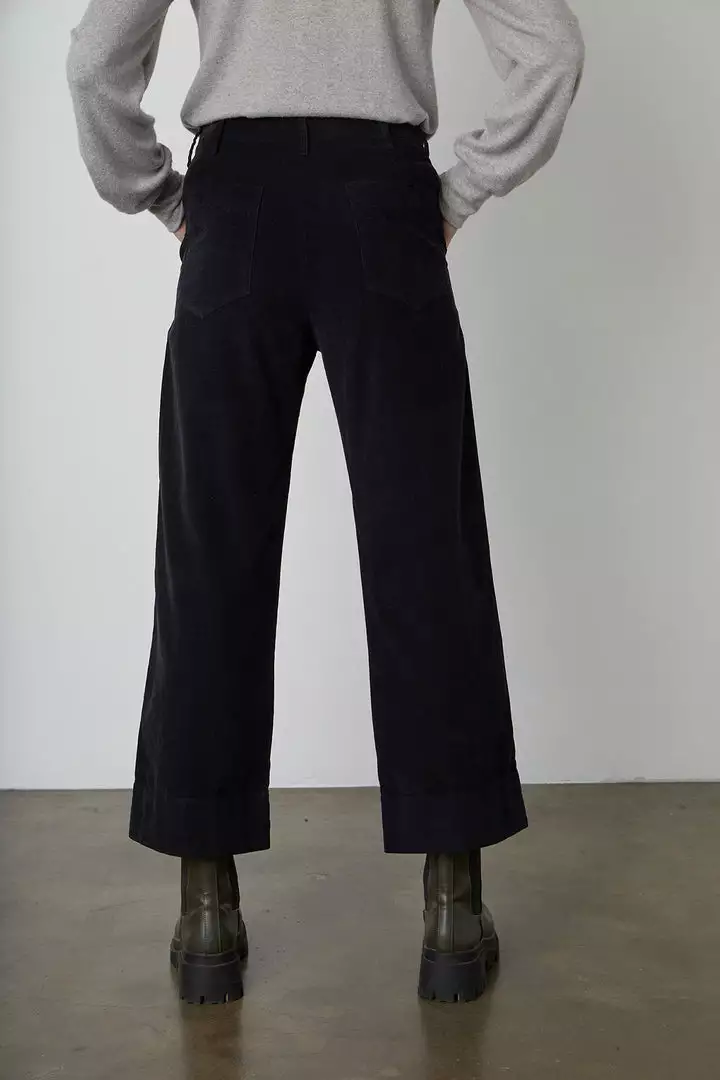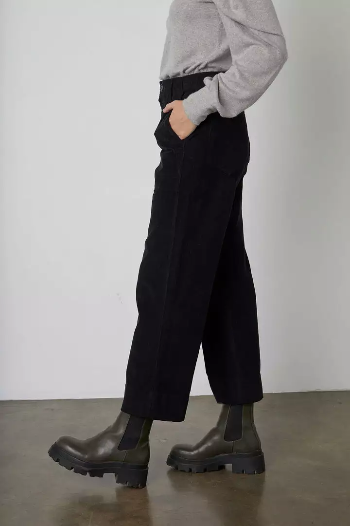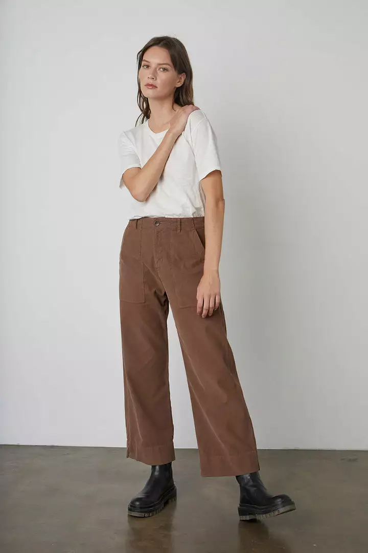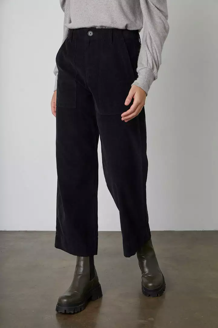 Featuring a pincord corduroy (this is the skinniest, least bulky type) these casual trousers are fab. With a cropped, wide leg and utility details like patch pockets on the front and rear, these bottoms have a slightly higher rise that hits at the natural waist. A flattering silhouette that is equally chic.