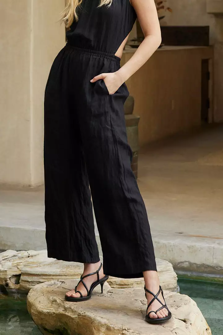 We love a great jumpsuit. Crafted from a lightweight linen, this one features a step-into silhouette with an elastic waist and unexpected cut-out on the back. A perfect day-to-night silhouette.