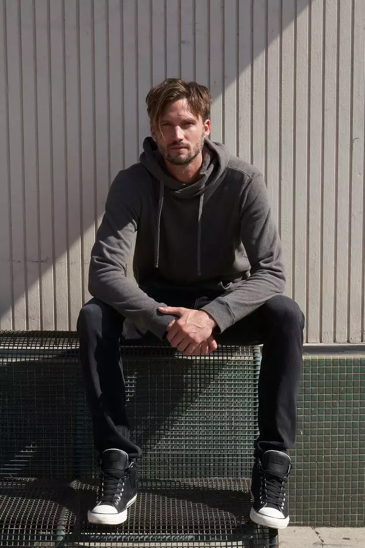 Home for the holidays. This is the hoodie you’ll wear to the gym, a casual lunch or couch surfing on a sunday. Crafted from our sturdy yet soft jaspe sherpa, this hoodie features a subtle funnel neck, a kangaroo pocket and split seams at the hemline.