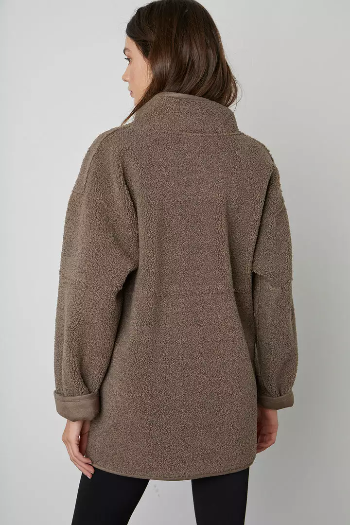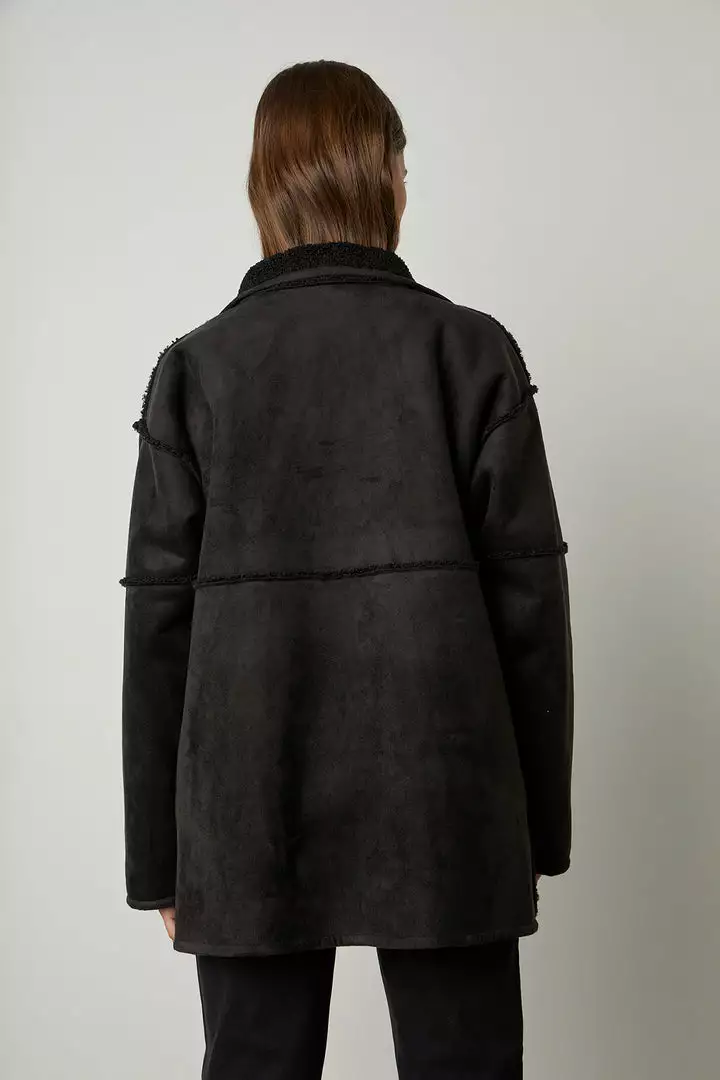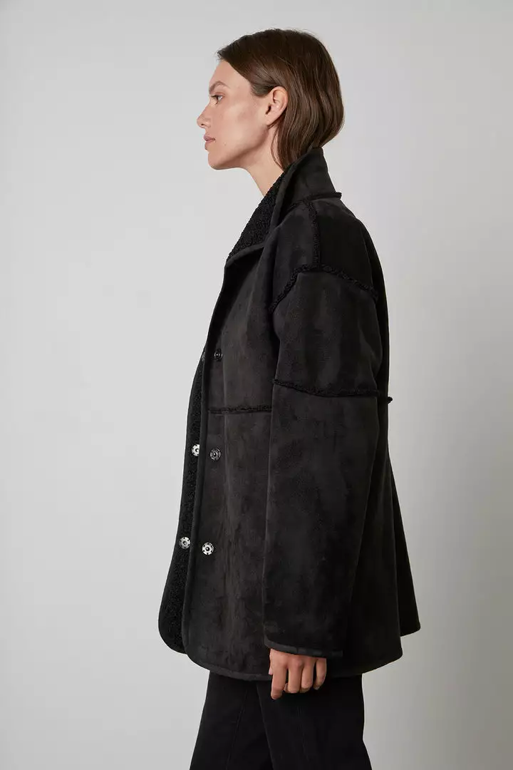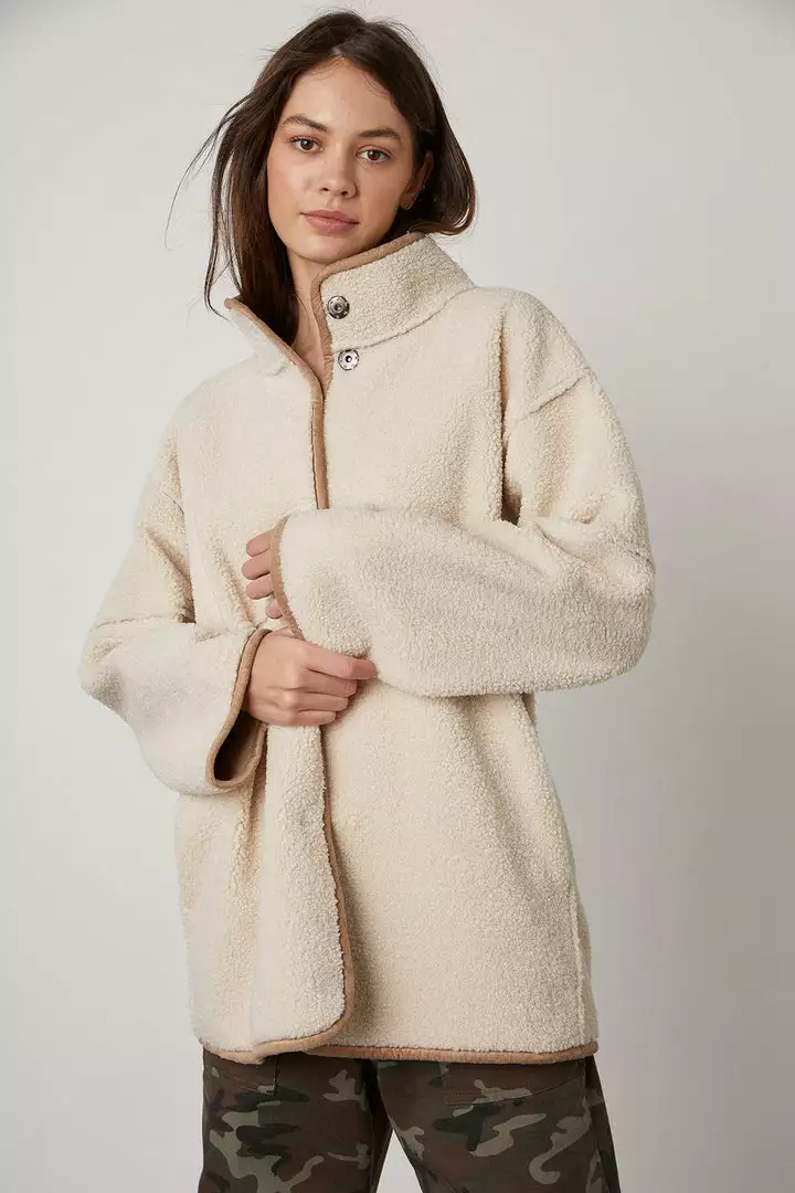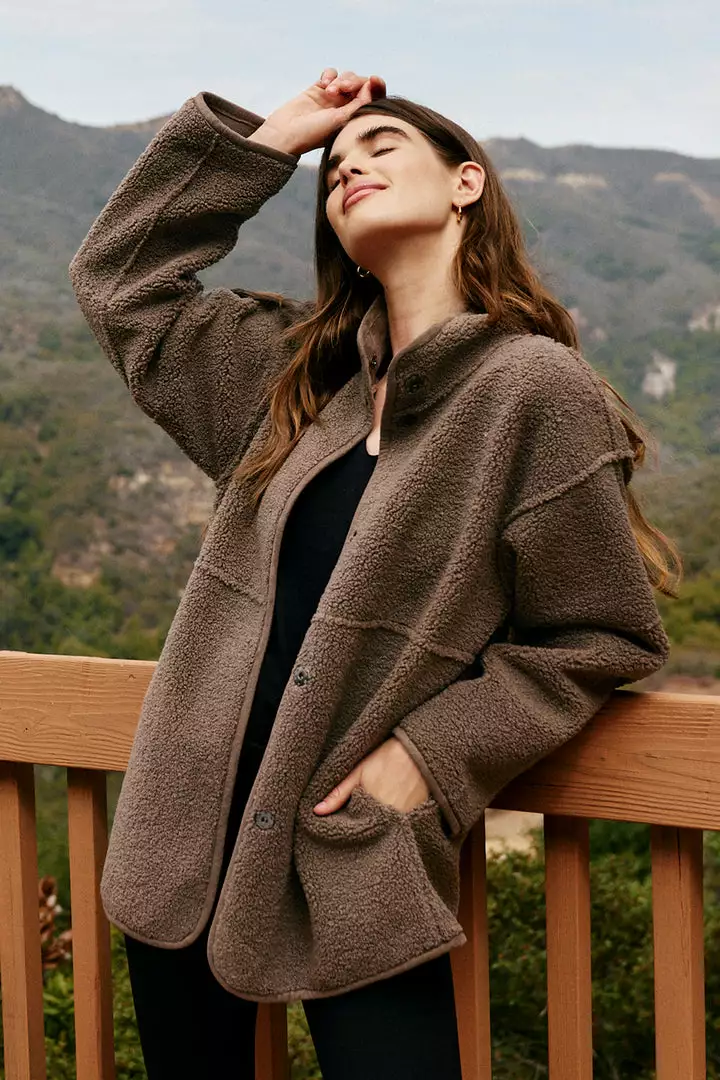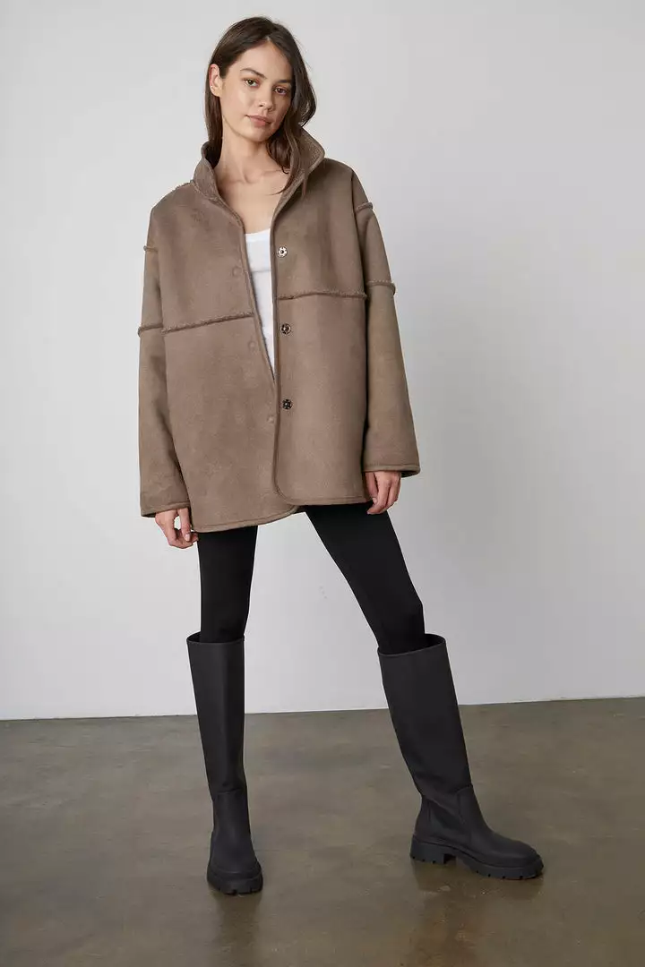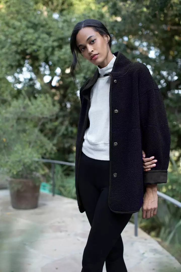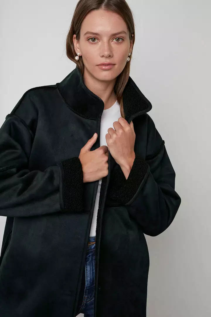 Up your coat game with this reversible beauty. One side is an eco-chic faux sherpa, while the other side is a faux fur. With a relaxed silhouette that’s perfect for layering over a chunky knit, it features slash pockets, popper buttons and a cool stand up collar.