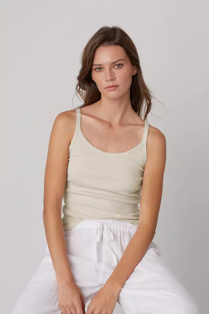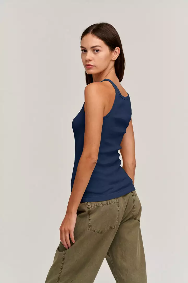 Well here’s the tank of your dreams. Crafted from our ribbed cotton slub, it skims the figure perfectly and has sturdy double-layer straps. The only layering tank you’ll ever need but it also looks sweet worn solo.