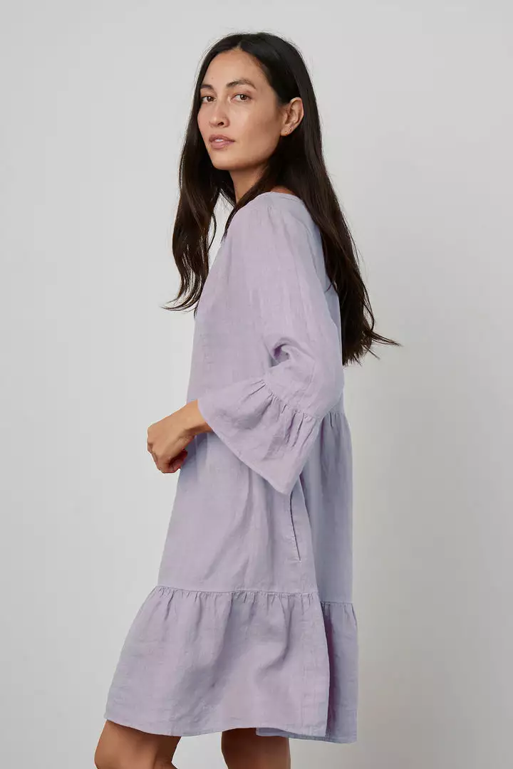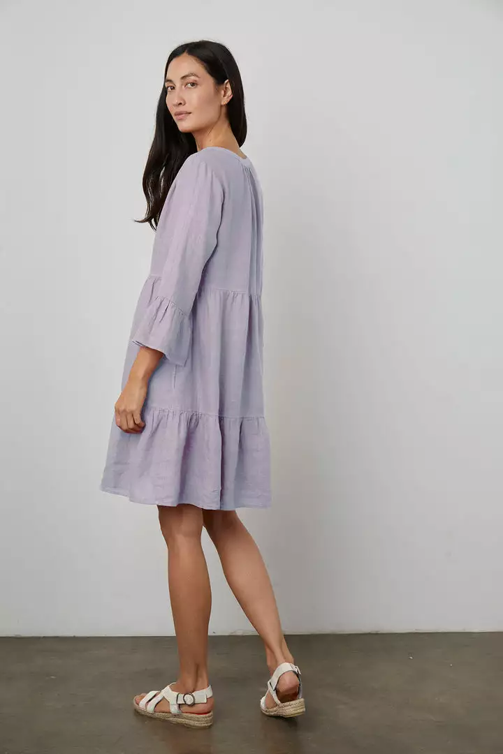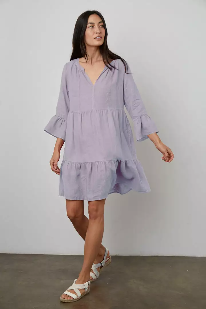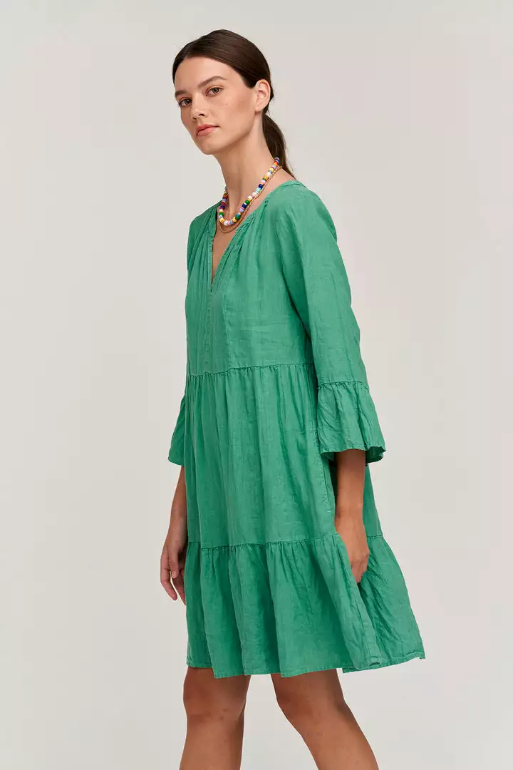 Crafted from a woven linen, this easy-on frock features a tier-frill silhouette that flares out to an A-line, as well as subtle ruffle on the sleeve and a V neckline. The perfect warm weather day-to-nighter.