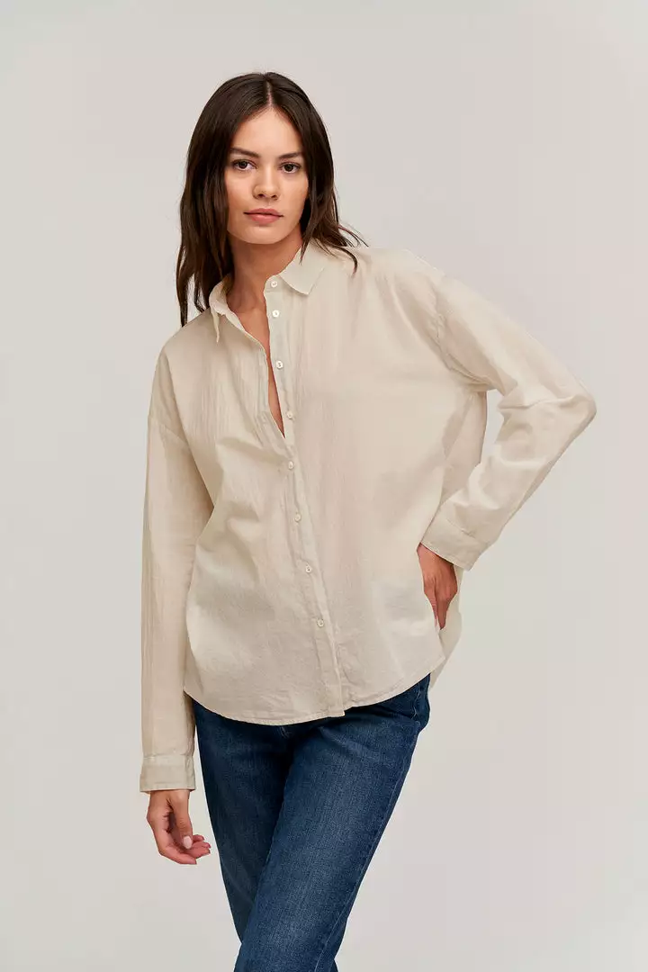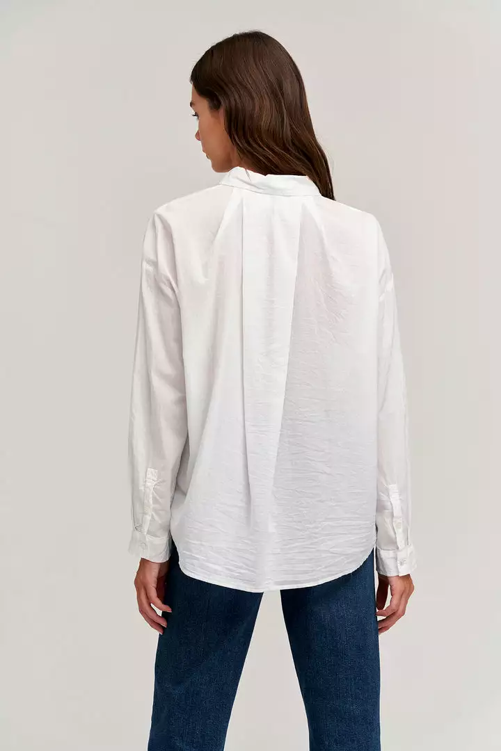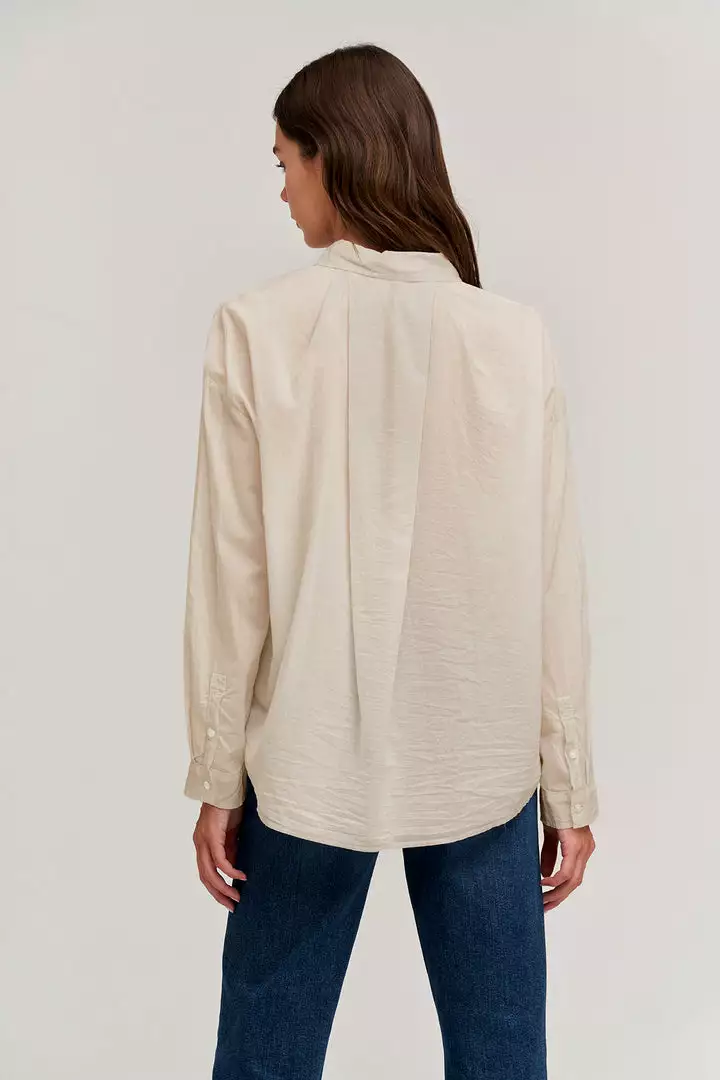 A relaxed button-up with a dual-pleat, rear detail that lends a delicate volume. A double-button cuff and a traditionally-scooped hemline add a tomboy edge.