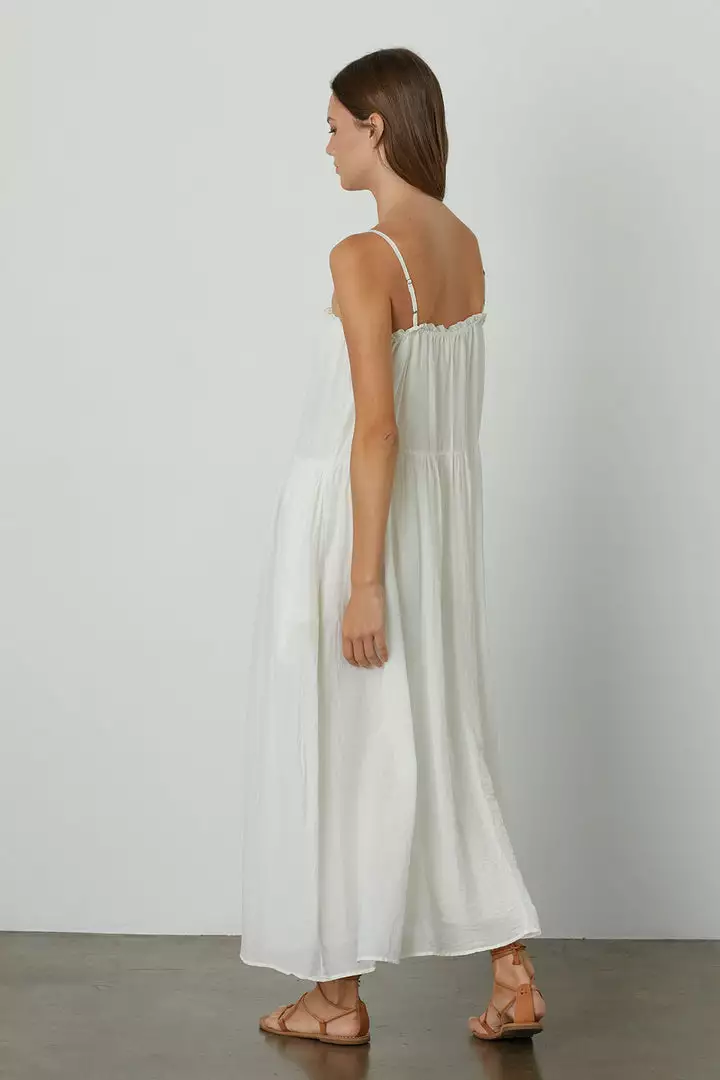 So lovely. Crafted from a luxe silk voile which adds an elevated sheen, this dress has all the easy details of summer style with adjustable straps, a flowing silhouette and diminutive ruffle at the bust.