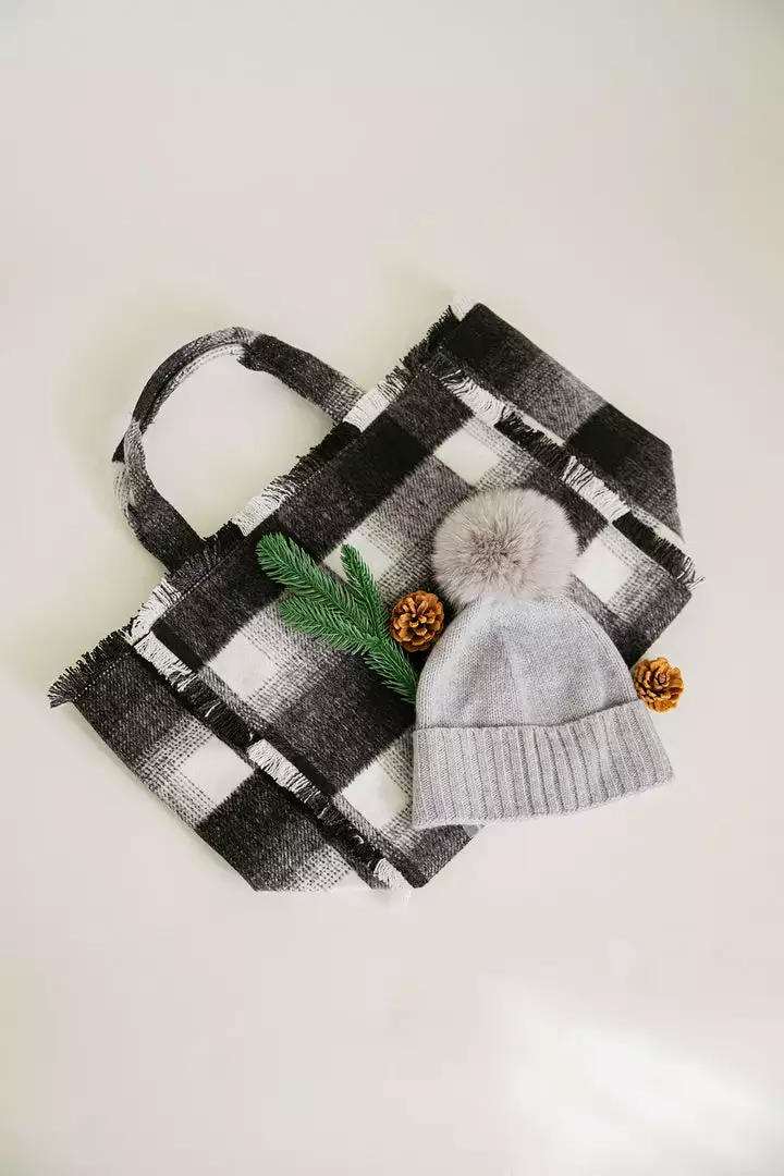 Perfect for wintery errands or weekend getaways. A chic plaid flannel with fringe trims along the seams, it’s big enough to hold laptops as well as all your essentials for the day.