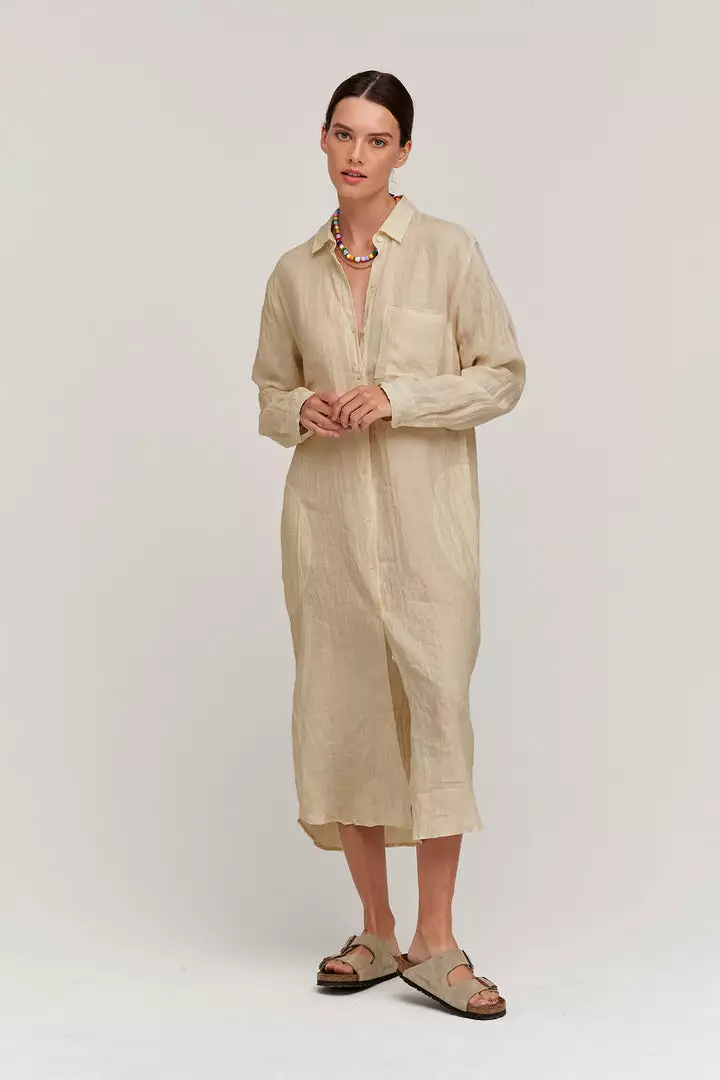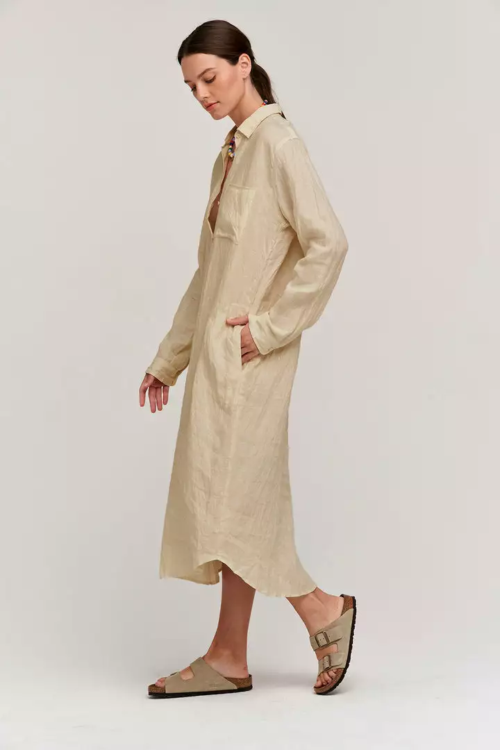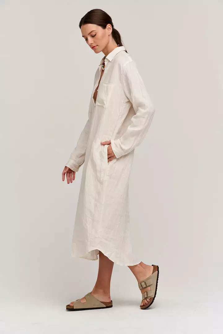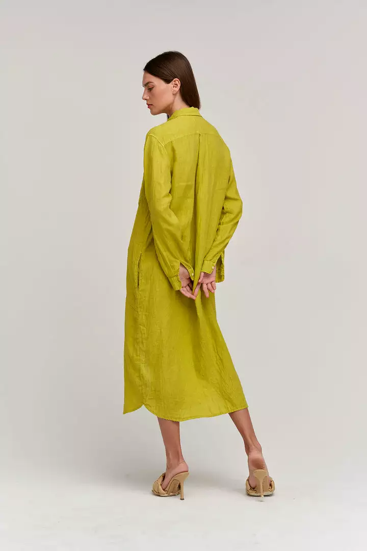 The classic shirt dress is always a Velvet favorite with its 24/7 versatility. Crafted from a spring-weight linen and with a mid-maxi length, this dress is designed to layer over the Lola pant or be worn solo.