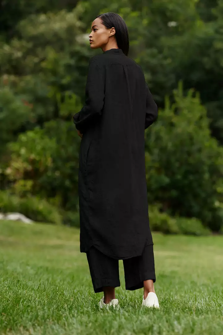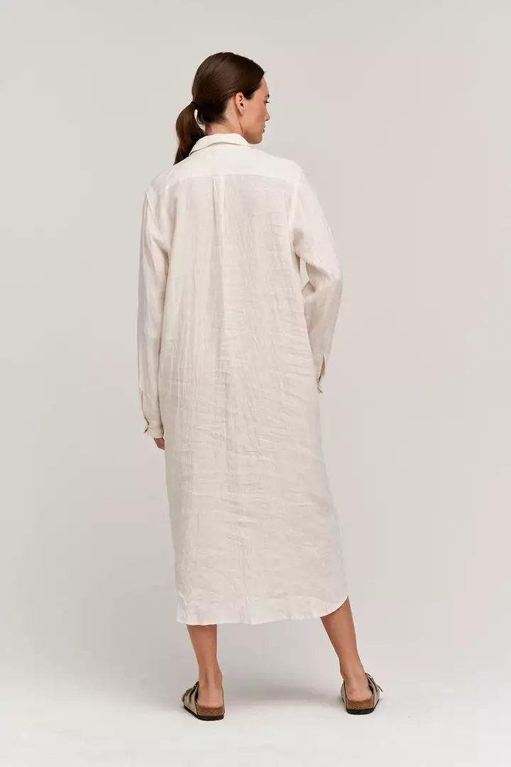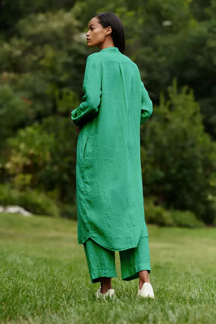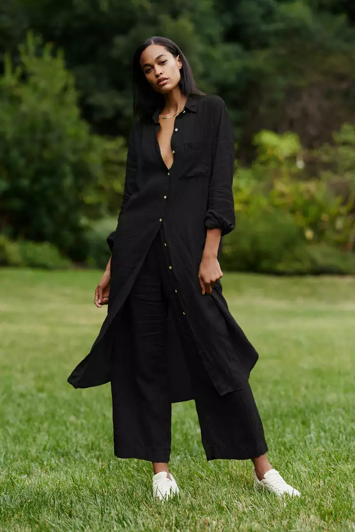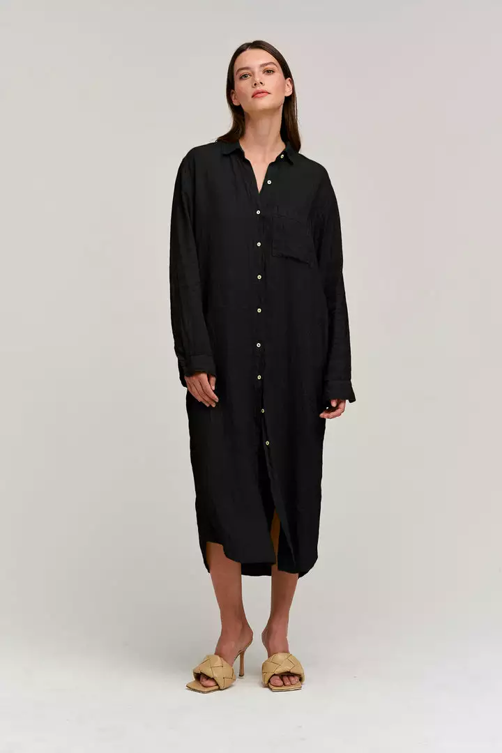 The classic shirt dress is always a Velvet favorite with its 24/7 versatility. Crafted from a spring-weight linen and with a mid-maxi length, this dress is designed to layer over the Lola pant or be worn solo.