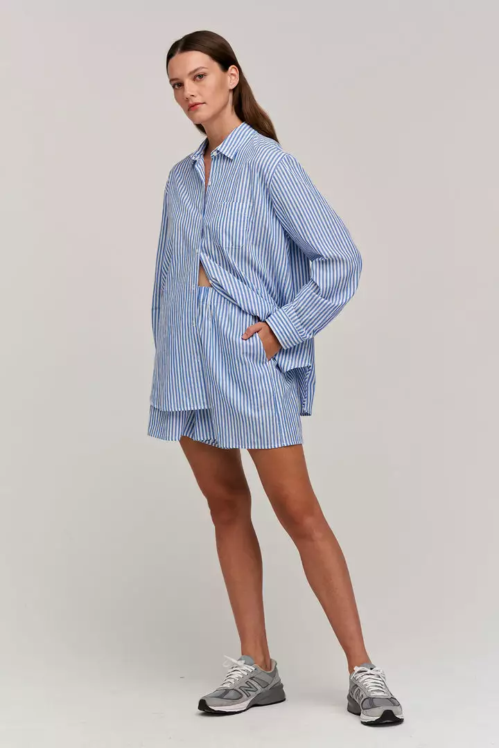Crafted from a soft cotton woven, these shorts have a hint-of-flare to leg making them ultra-flattering, while the blue and white ticking stripe launches a new classic.