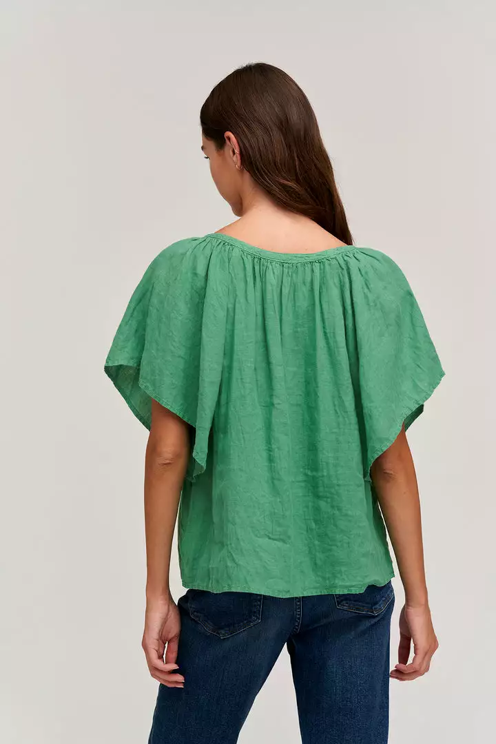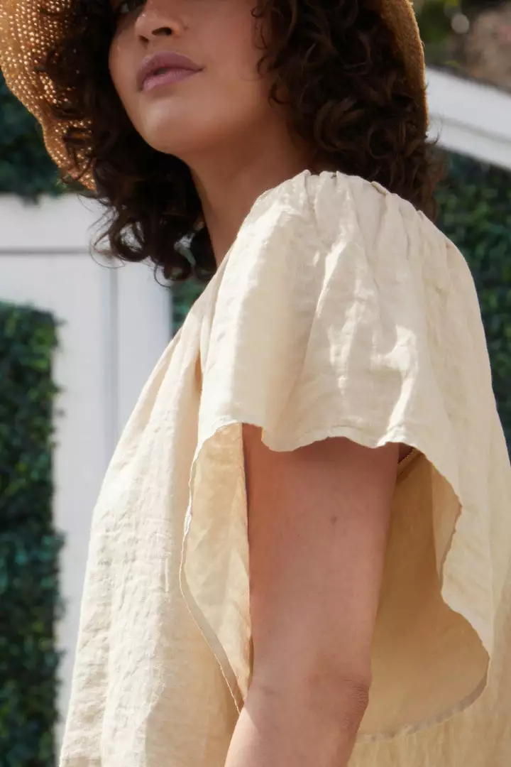 Crafted from a lightweight linen, this top features a relaxed silhouette with a shirred seam around the neckline which creates a voluminous silhouette to the torso. The flutter sleeves have also been given a dose of easy volume and the final effect is chic and easy.