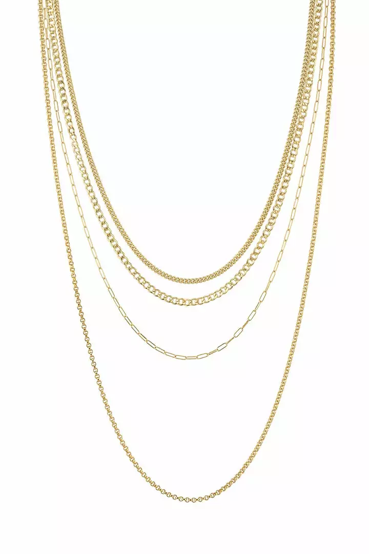 multi-tasking multi-layer. crafted from four sterling silver chain with gold plating, this necklace makes accessorizing a snap since it’s such a stand out. secured with a traditional lobster clasp in the rear, the different size chains drape gorgeously at different lengths and will make any décolleté look p.m. glam.