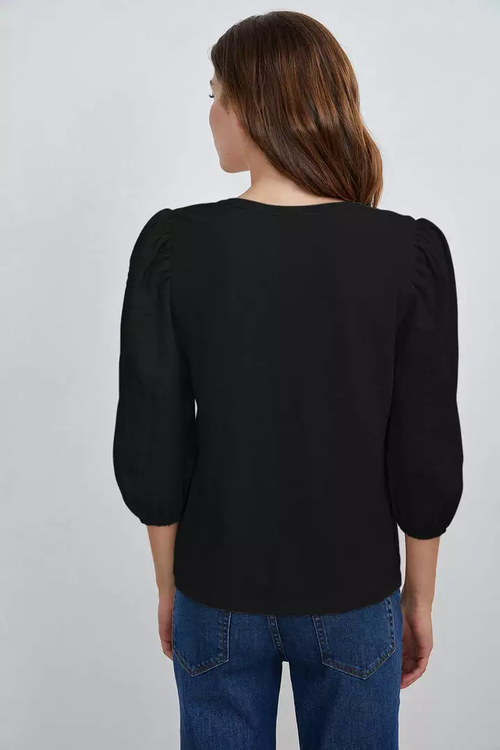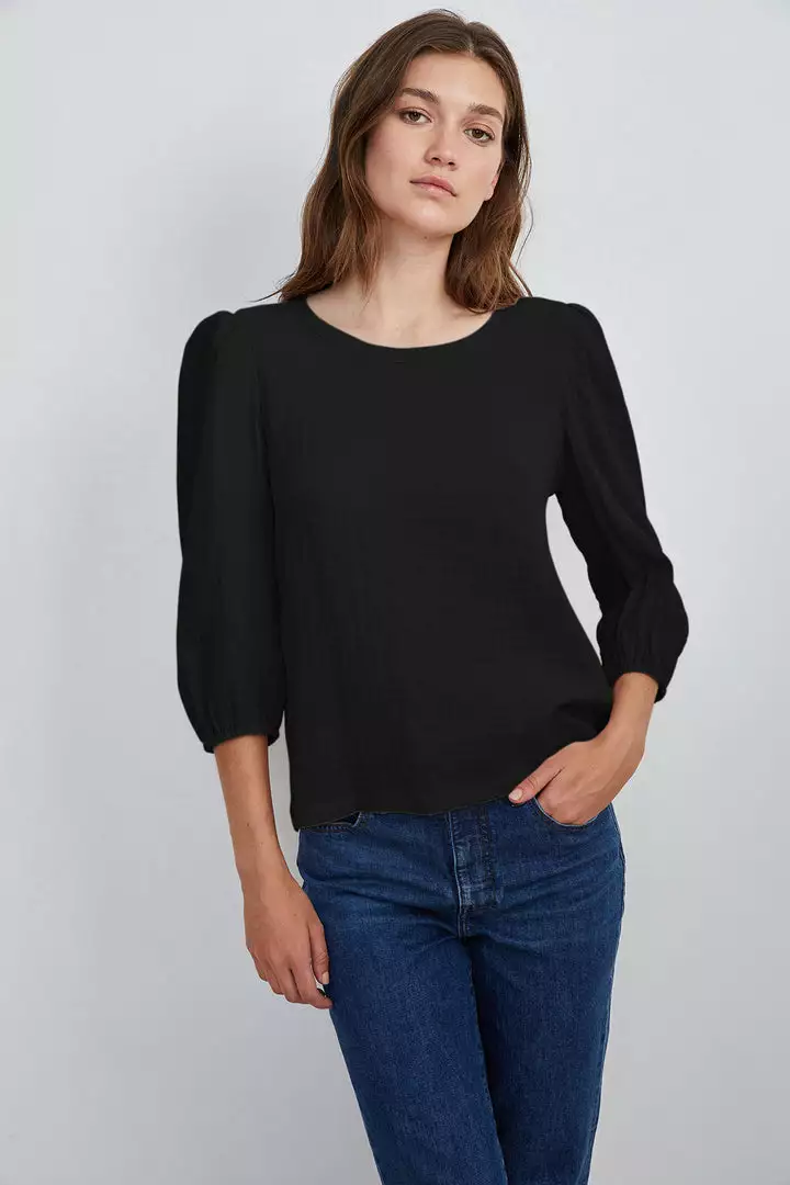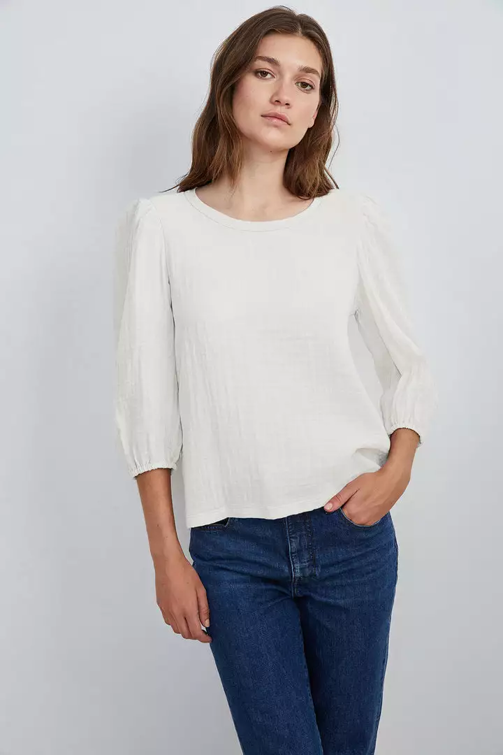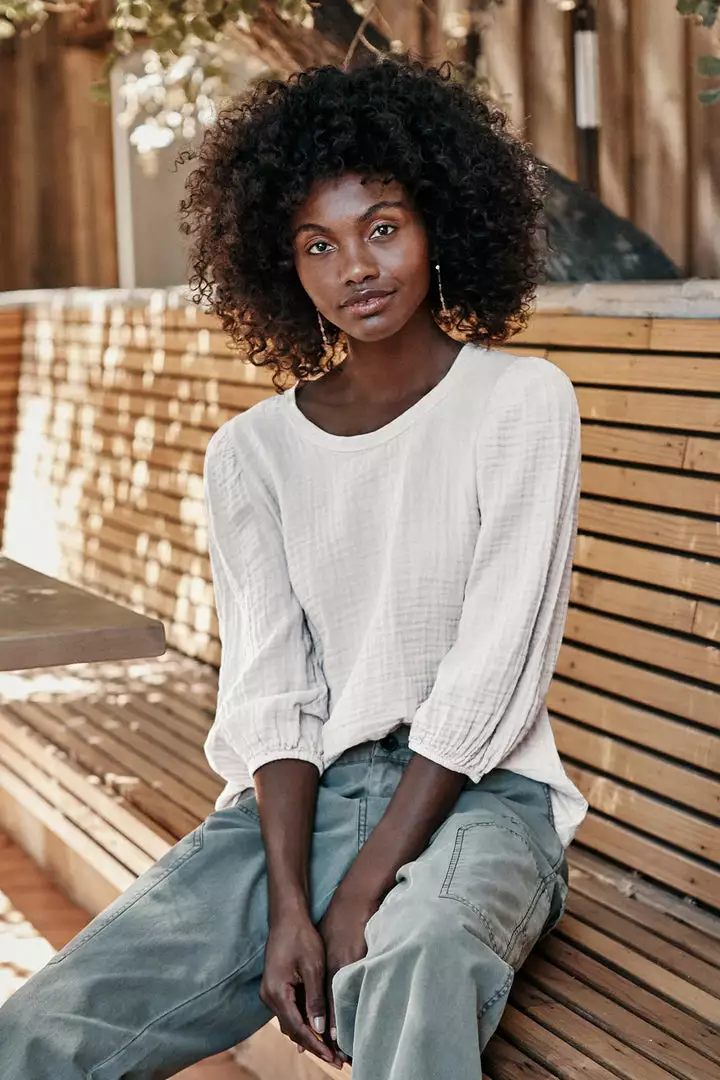 The juxtaposition of a cotton gauze front and sleeves with the cotton slub back gives this top an unexpected twist. A puffed sleeve with a slight crop makes this an anytime essential.