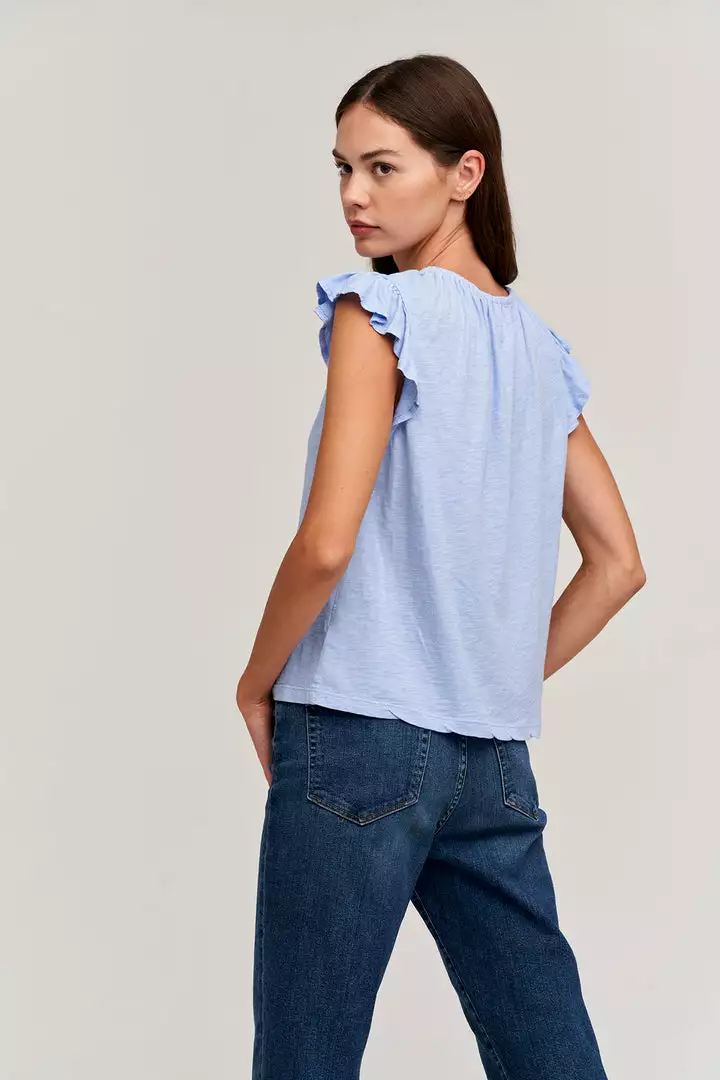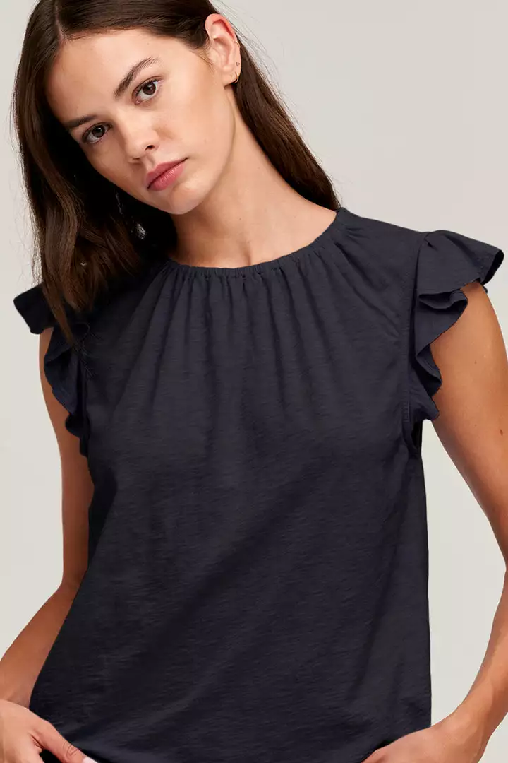 Our signature cotton slub, with a soft heathered texture and softness, has been given a delicate makeover with the ruffled sleeve. The elastic at the neckline creates a hint of volume that is spring perfection.