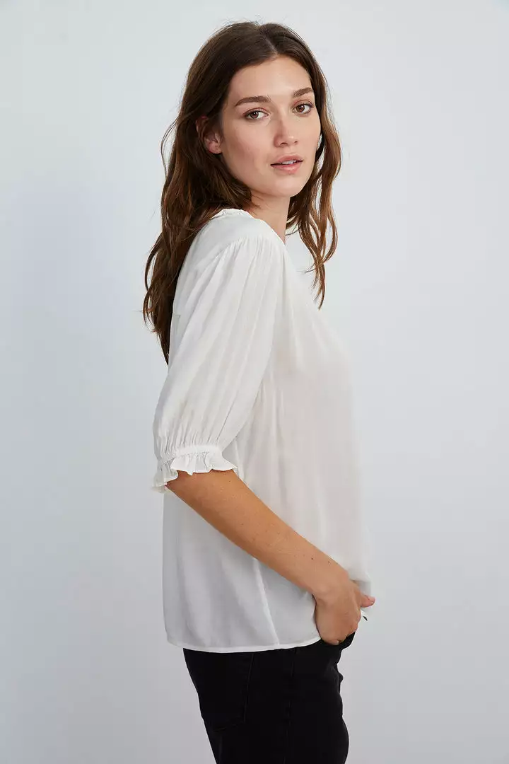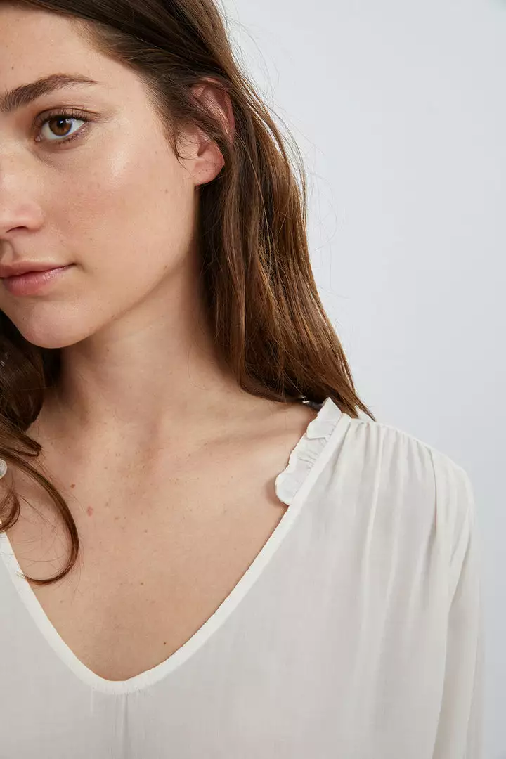 Volume in all the right places–a ruffled sleeve and shirred rear seams–take this top into instant-classic territory. Crafted from our signature challis and topped off with a demure ruffle at the neck and sleeve.