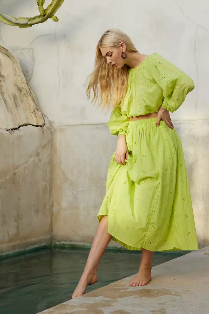 A nod to the bohemian spirit with this ankle-skimming maxi skirt. Crafted from a lightweight cotton that features a delicate eyelet embroidery. Pair with the matching Yara blouse for top-to-toe chic.