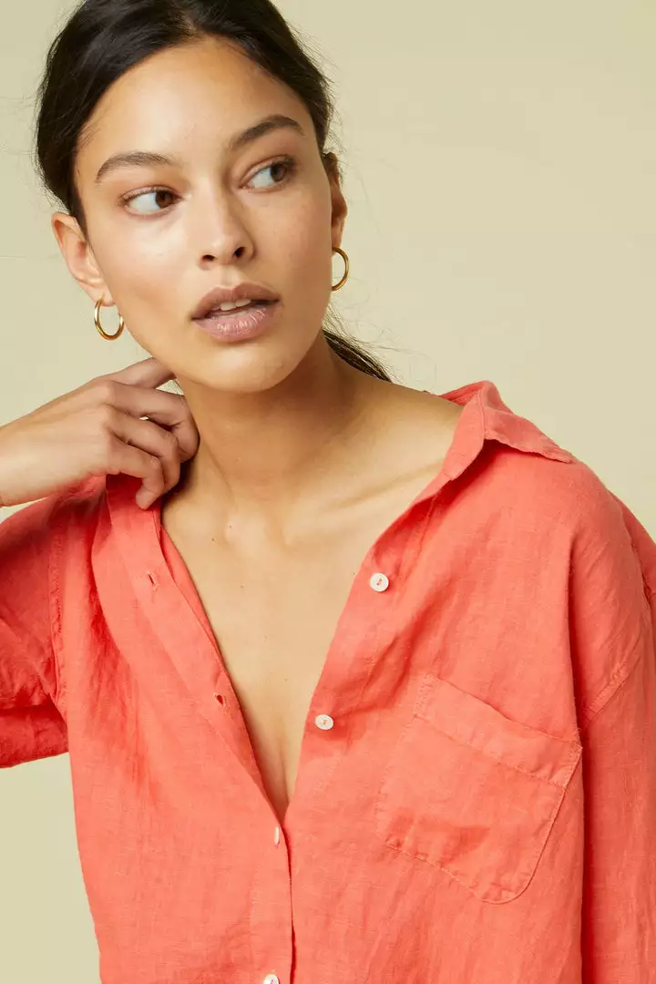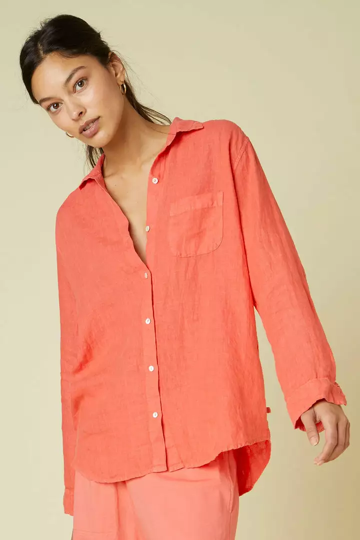 Considered one of the ultimate essentials, this linen button up has a slightly relaxed silhouette that lends an added ease to the styling. The scooped hemline looks equally chic tucked or left loose.